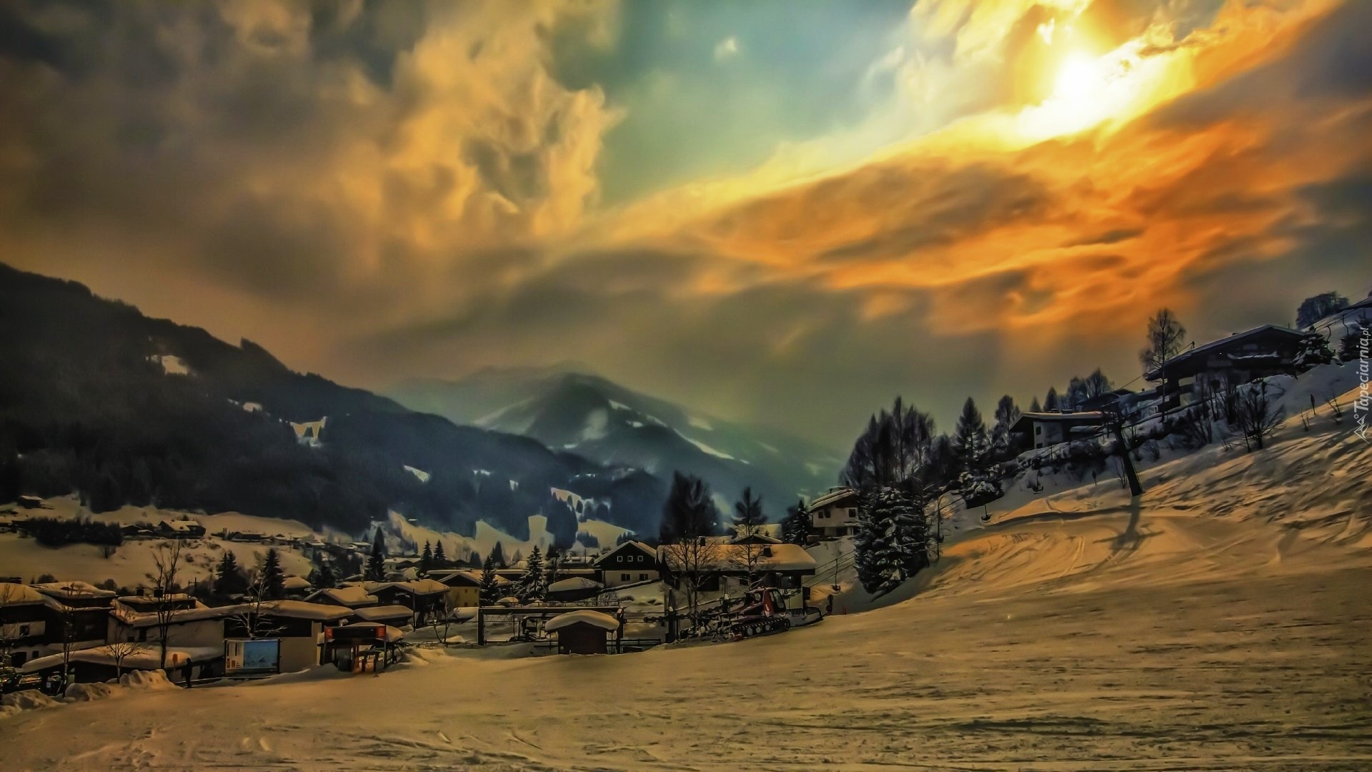 Edytor tapety: Miasteczko, Góry, Chmury, Zima, Austria