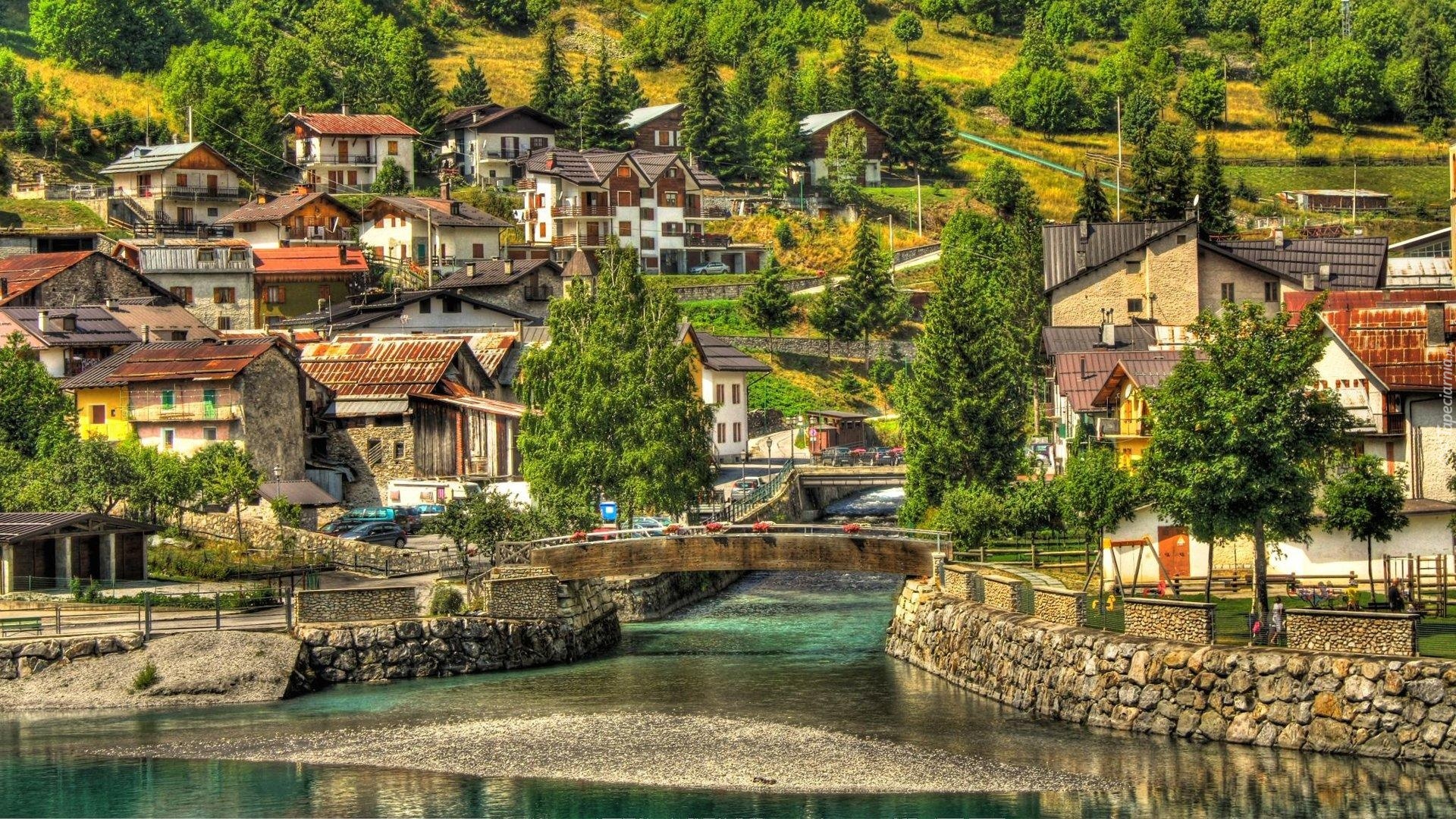 Edytor tapety: Włochy, Pietraporzio, Miasteczko, Rzeka, Mostek, Drzewa