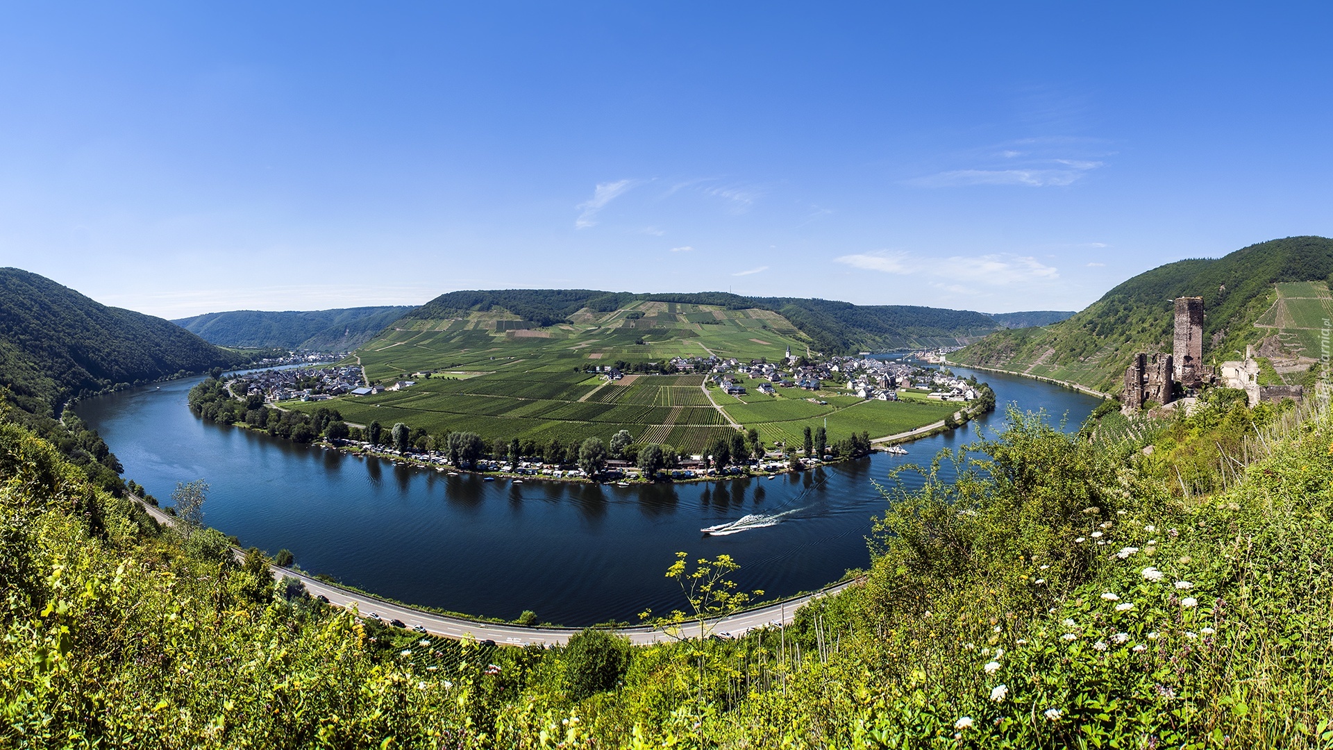 Edytor tapety: Rzeka, Wzgórza, Pola, Rosliny