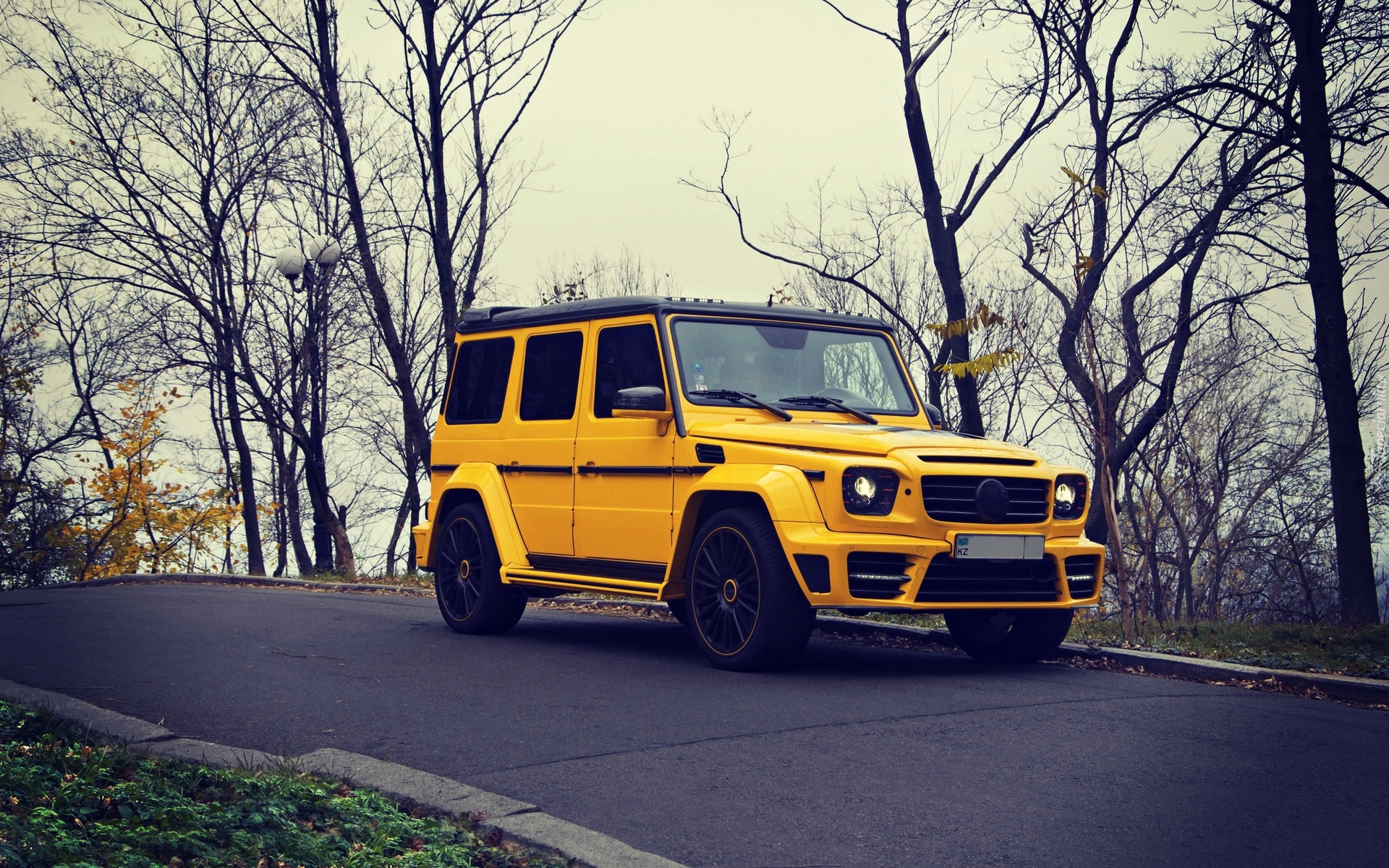 Edytor tapety: Żółty, Mercedes, Benz, G63, Jesień, Droga, Drzewa