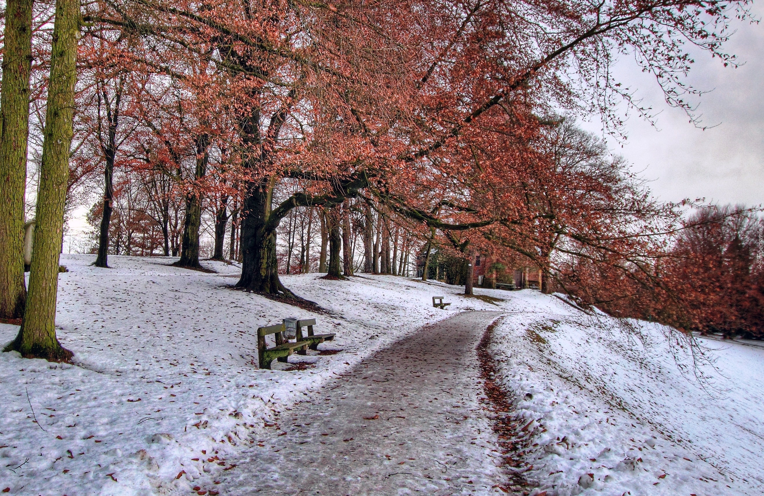 Edytor tapety: Zima, Park, Ławeczki
