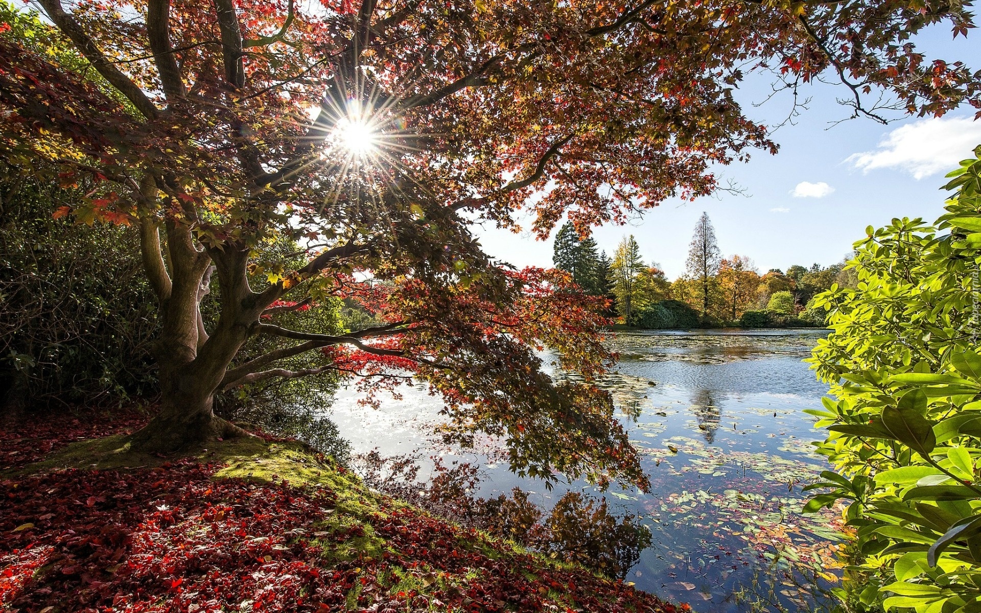Edytor tapety: Jezioro, Drzewa, Liście, Promienie, Słońca, Jesień