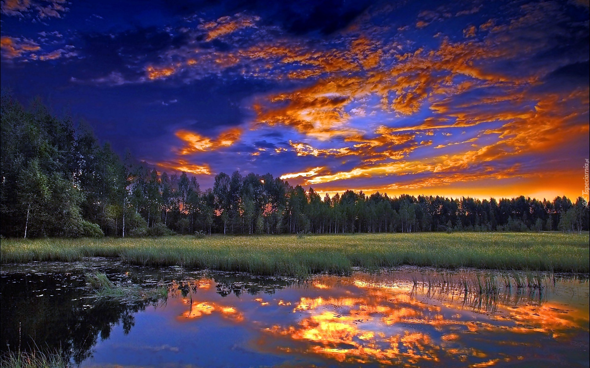 Edytor tapety: Las, Jezioro, Szuwary, Chmury, Przebijające, Światło, Odbicie