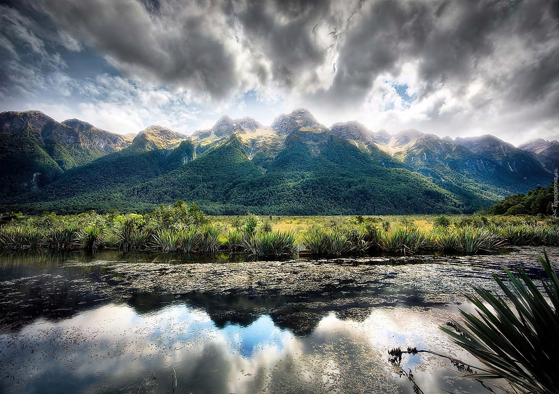 Edytor tapety: Jezioro, Mirror, Góry, Chmury, Roślinność, Odbicie