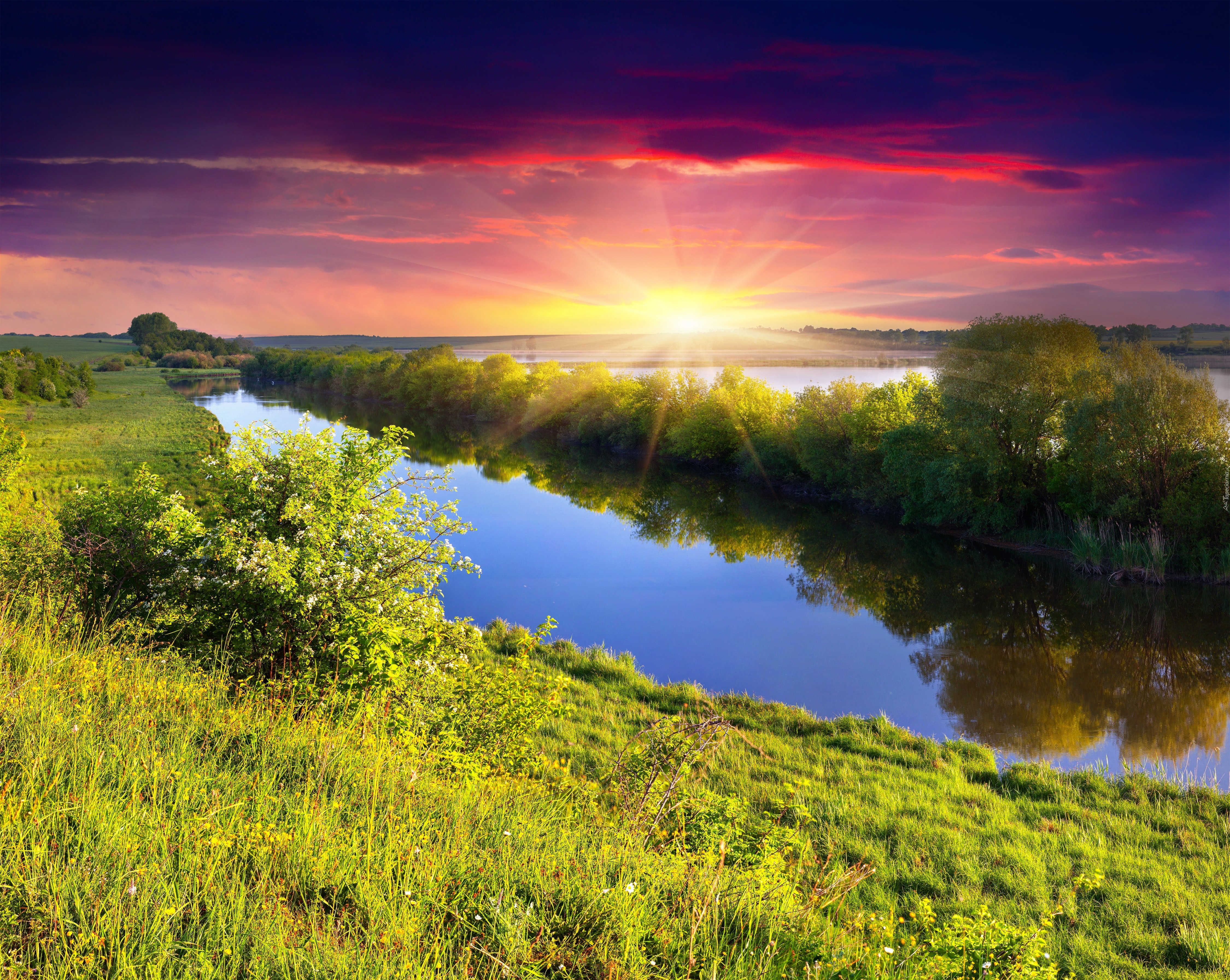 Edytor tapety: Rzeka, Łąki, Drzewa, Promienie, Słońca, Jesień