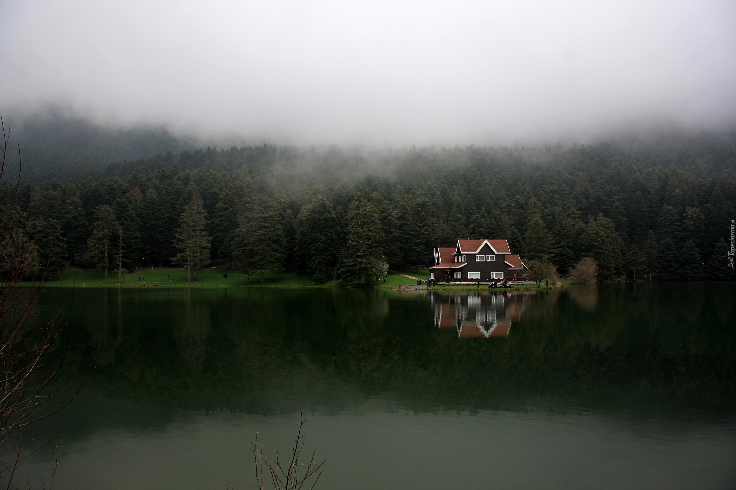 Edytor tapety: Jezioro, Las, Dom, Mgła, Odbicie