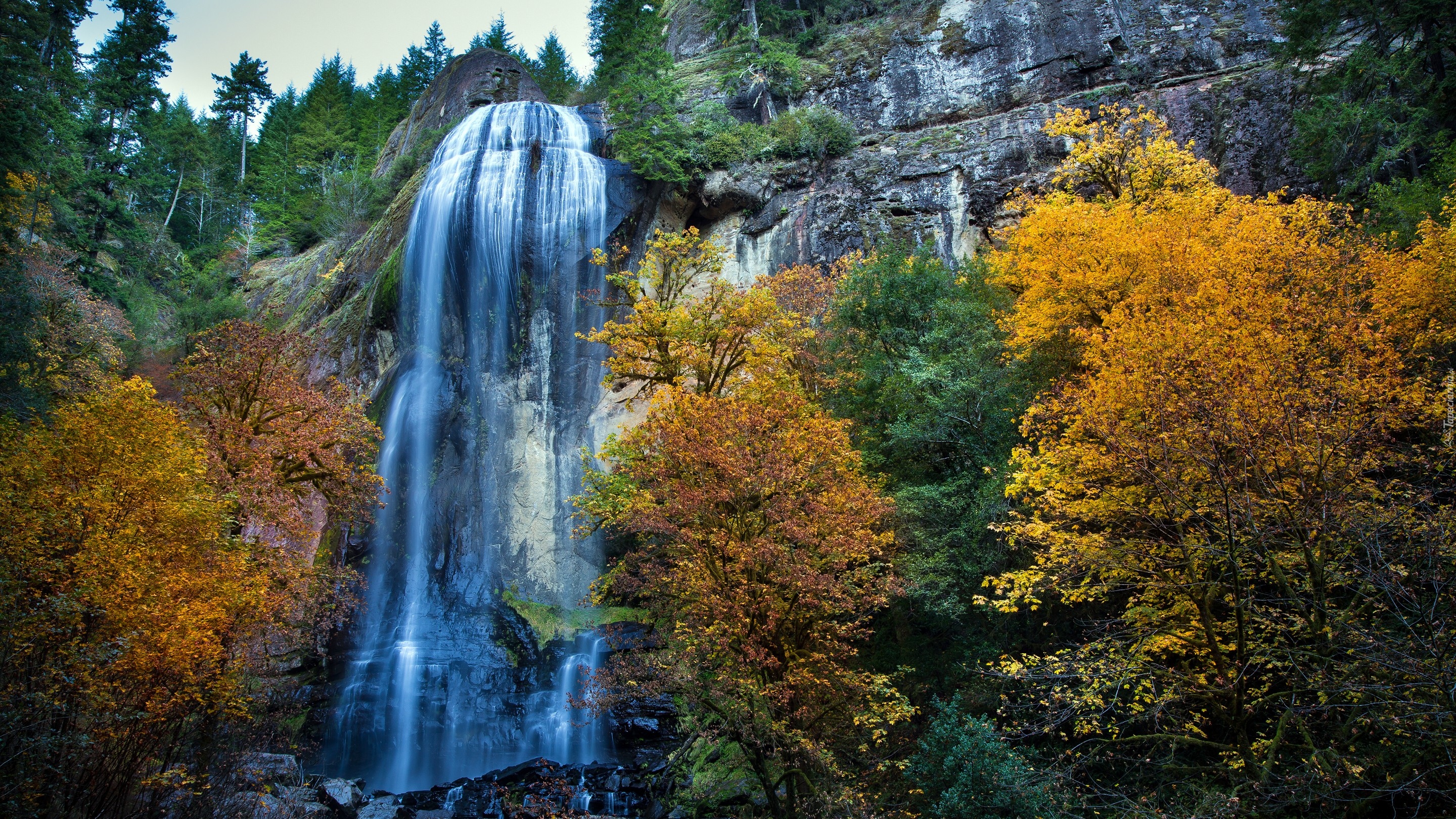 Edytor tapety: Wodospad, Jesień, Skały, Drzewa