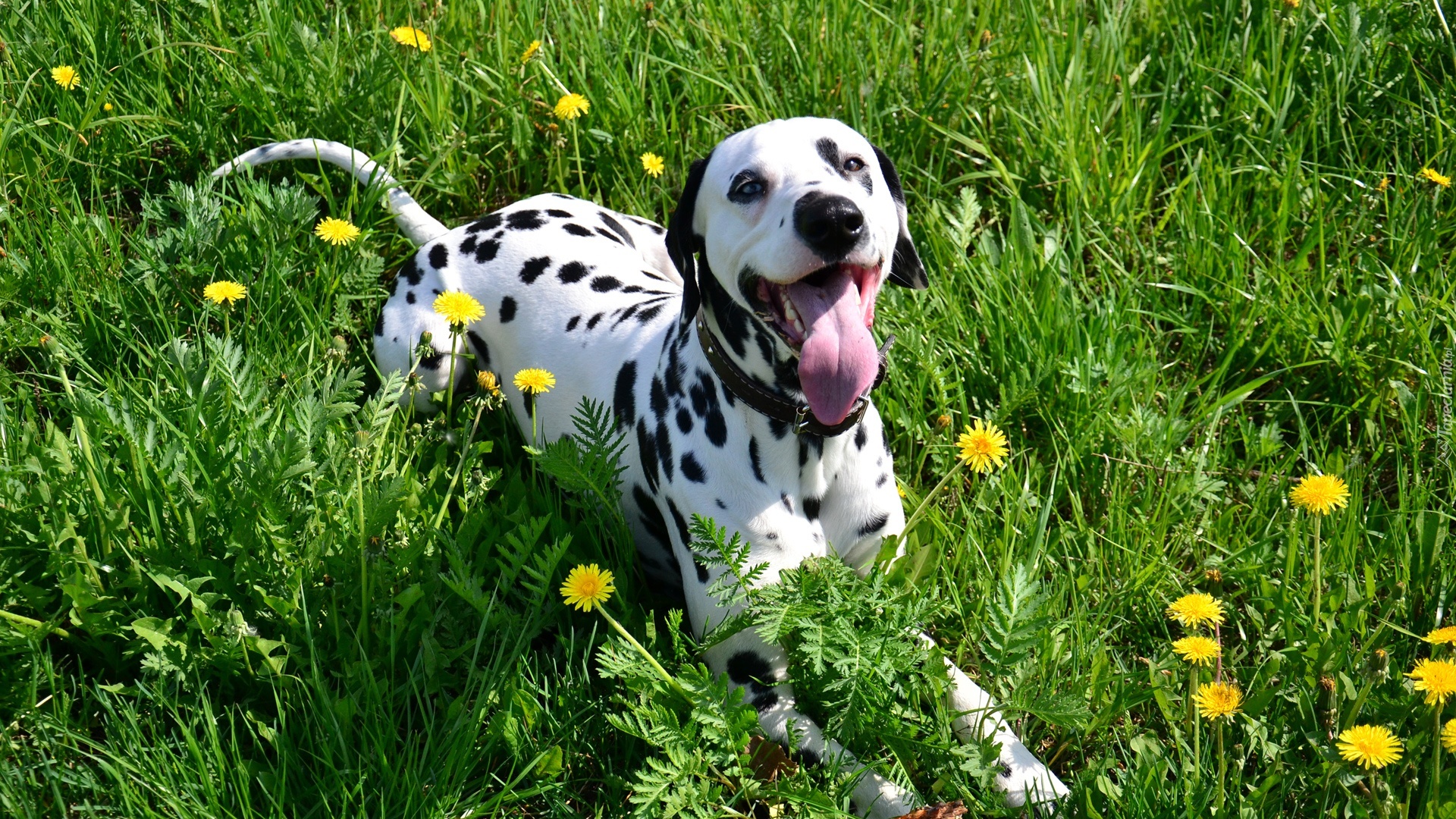 Edytor tapety: Pies, Dalmatyńczyk, Język, Trawa, Mniszek