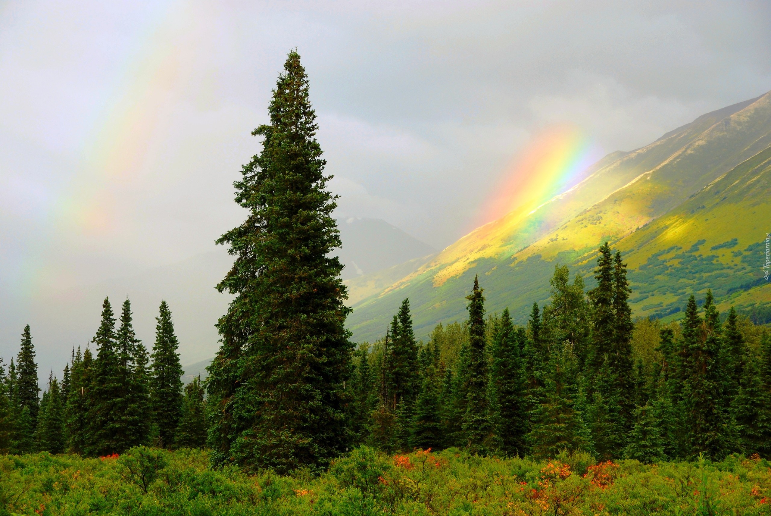 Edytor tapety: Góry, Las, Tęcza