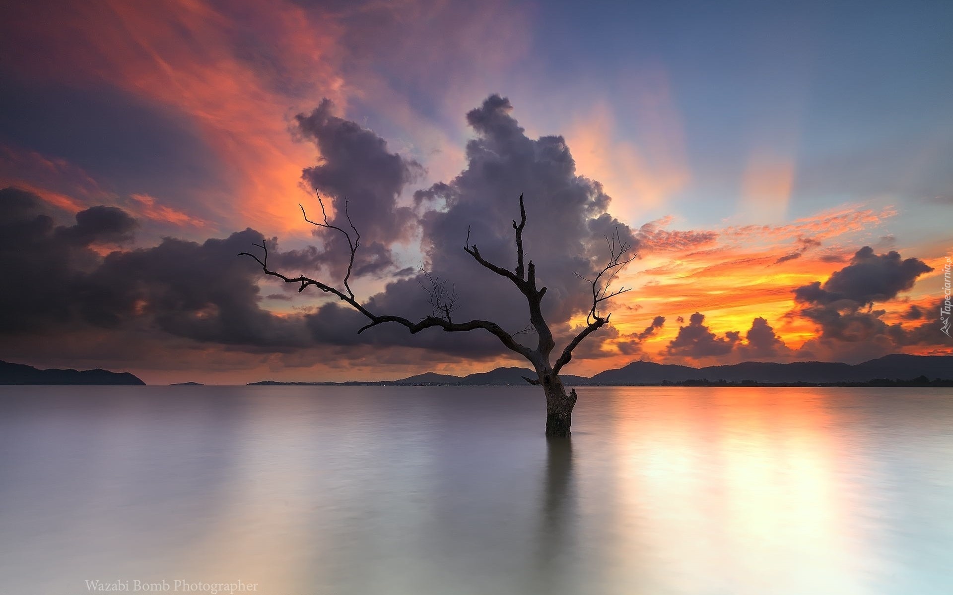 Edytor tapety: Drzewo, Jezioro, Góry, Chmury, Zachód, Słońca