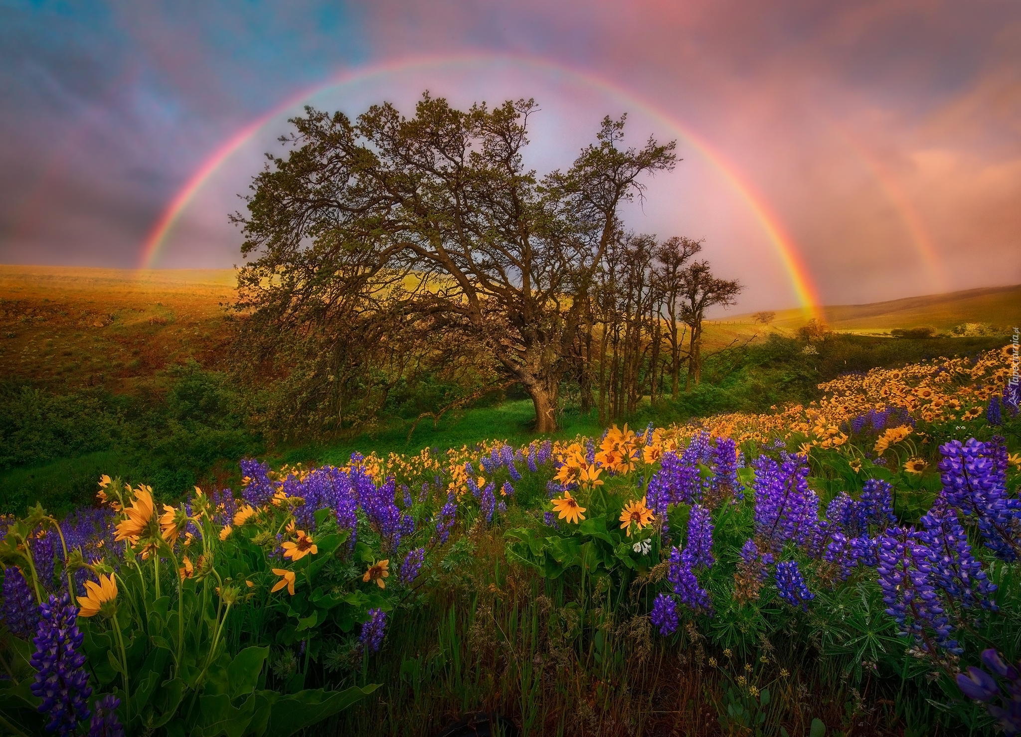 Edytor tapety: Drzewa, Pola, Łąki, Tęcza, Łubin, Słoneczniki