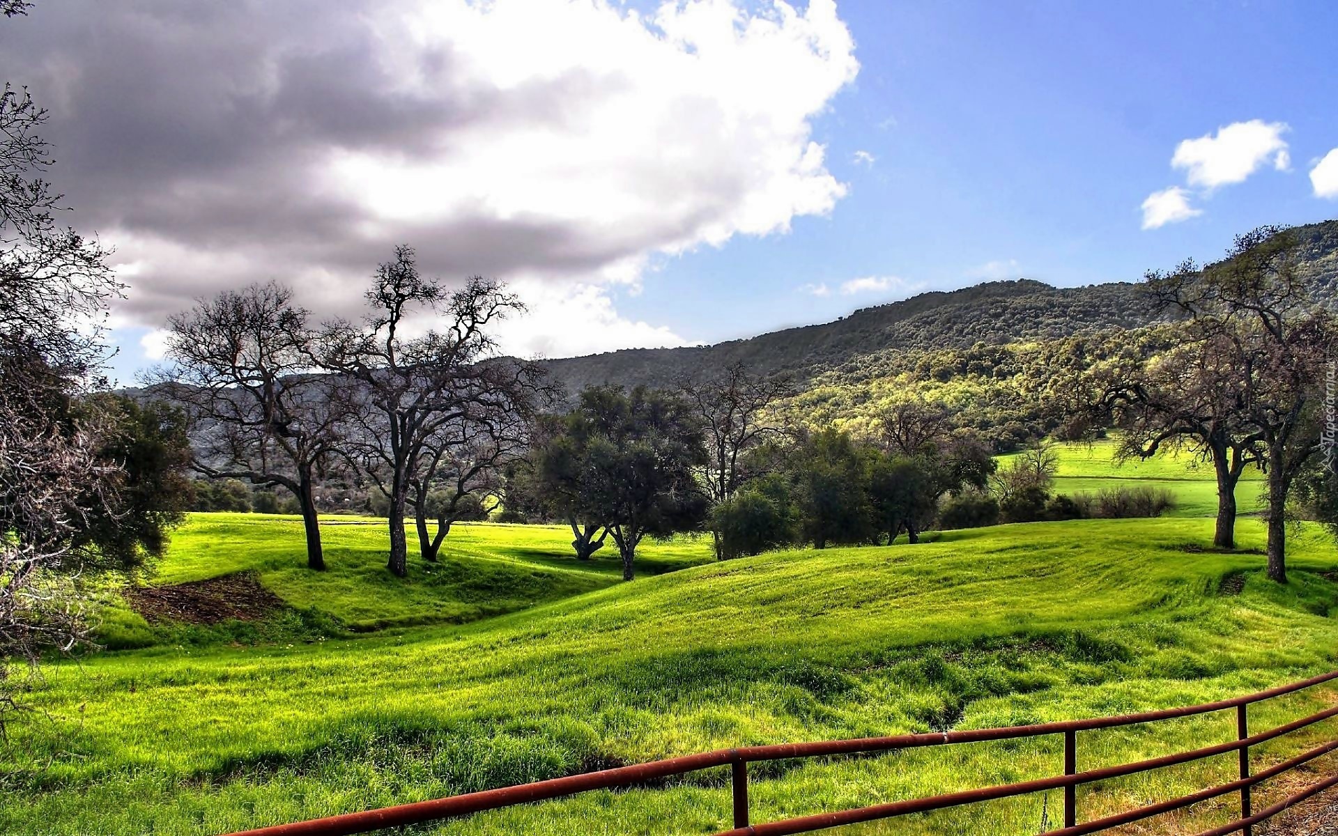 Edytor tapety: Chmury, Wzgórza, Lasy, Łąka, Drzewa, Ogrodzenie, Światło, Cień