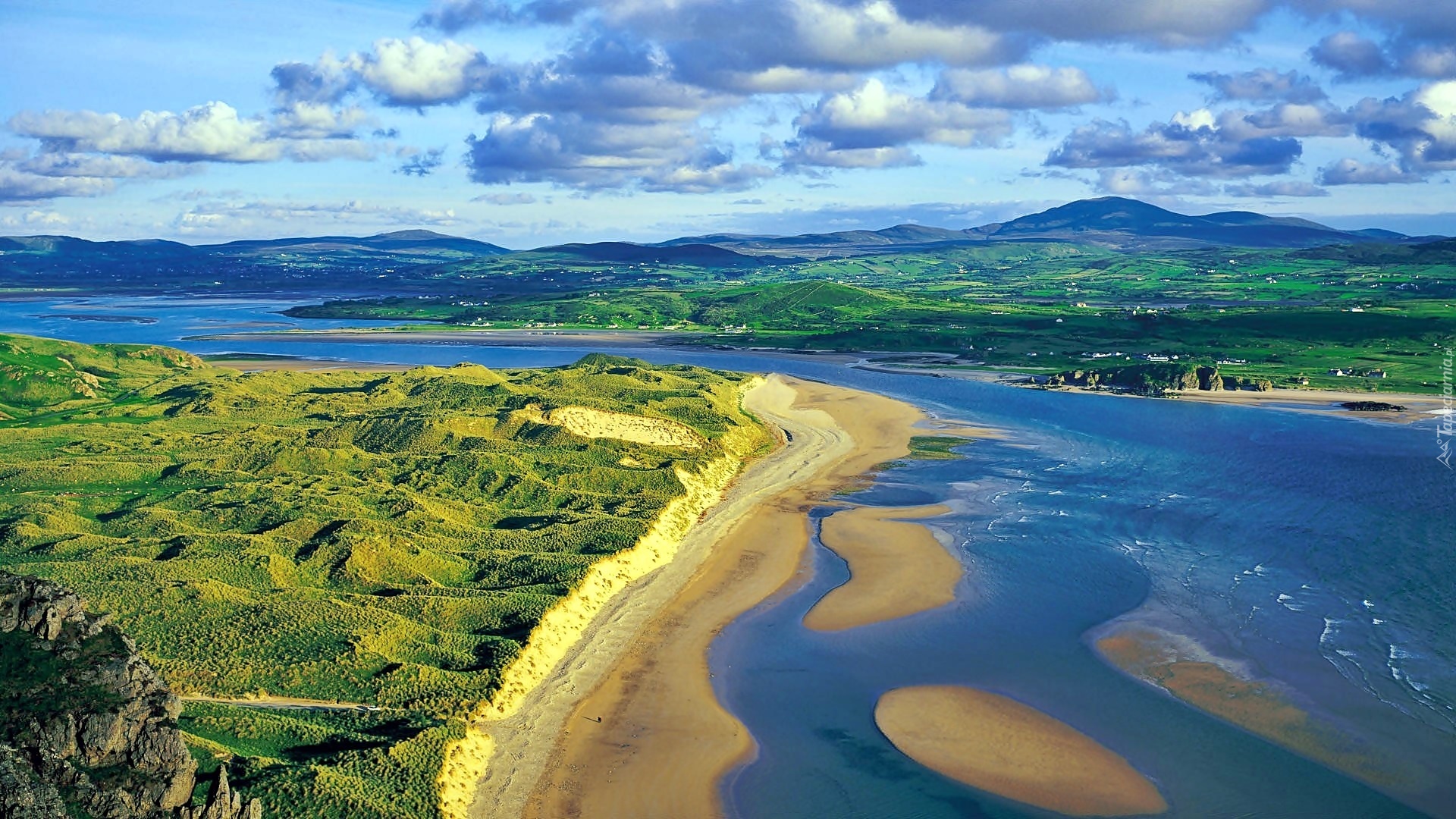 Edytor tapety: Morze, Zatoka, Plaża, Wzgórza, Pola, Łąki, Obłoki