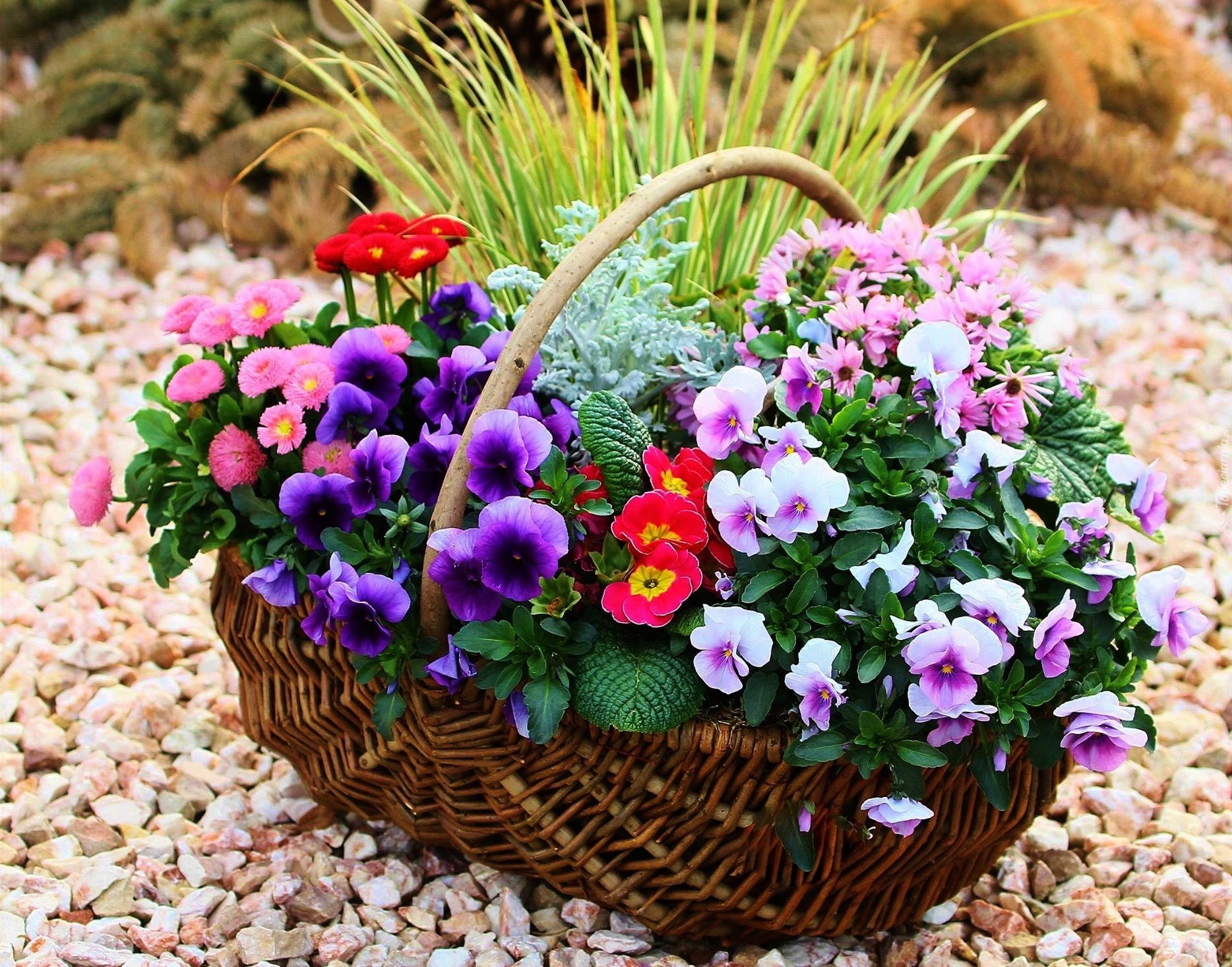 Edytor tapety: Kolorowe, Kwiaty, Koszyk, Kamyki