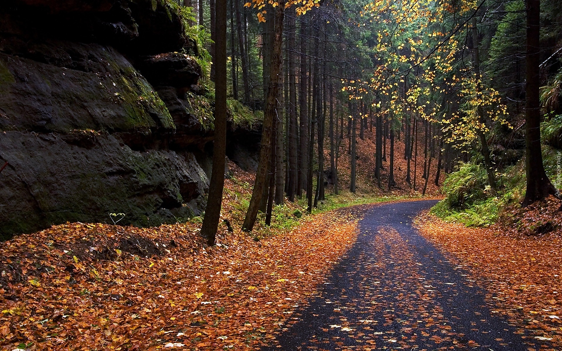Edytor tapety: Jesień, Skały, Las, Droga, Opadłe, Liście