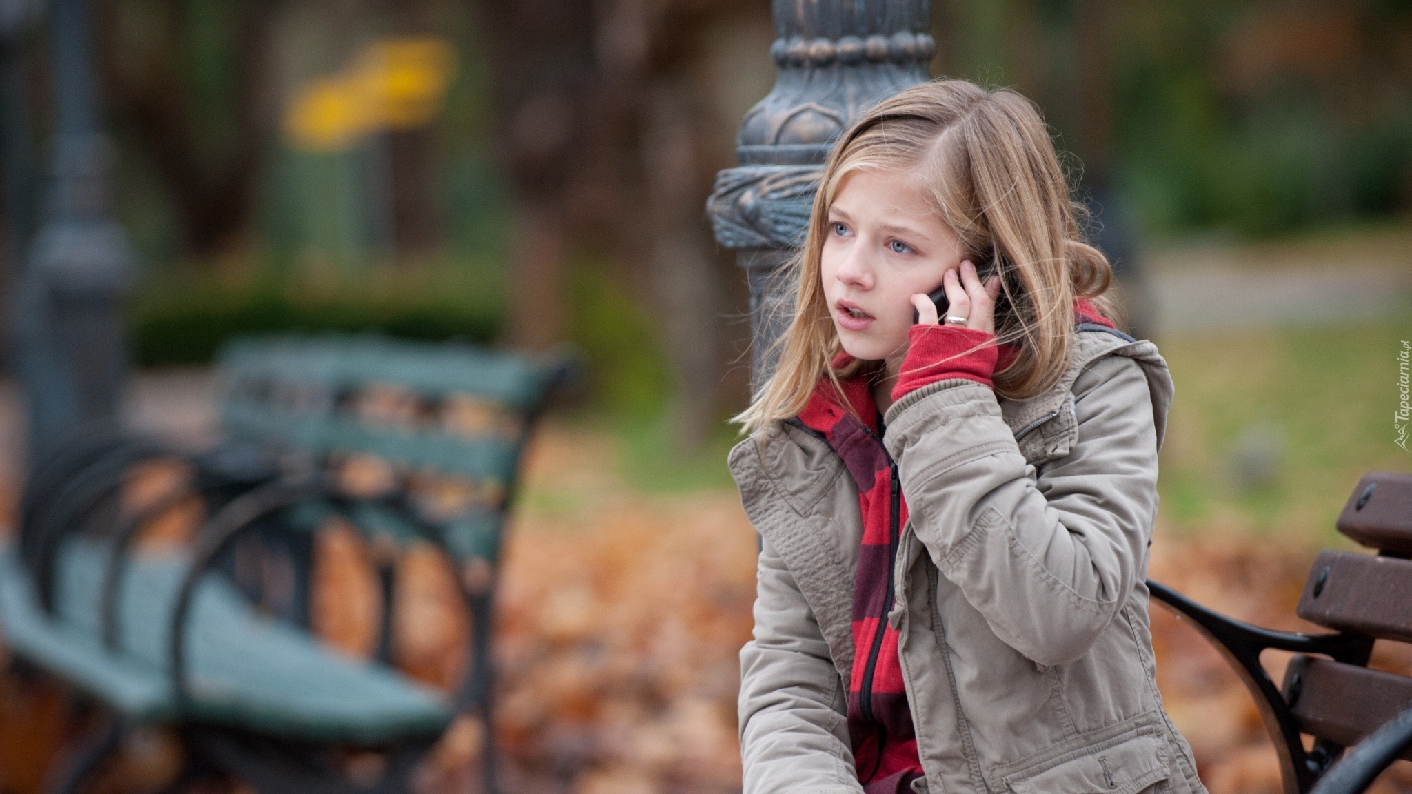 Edytor tapety: Park, Ławki, Dziecko, Dziewczynka, Telefon