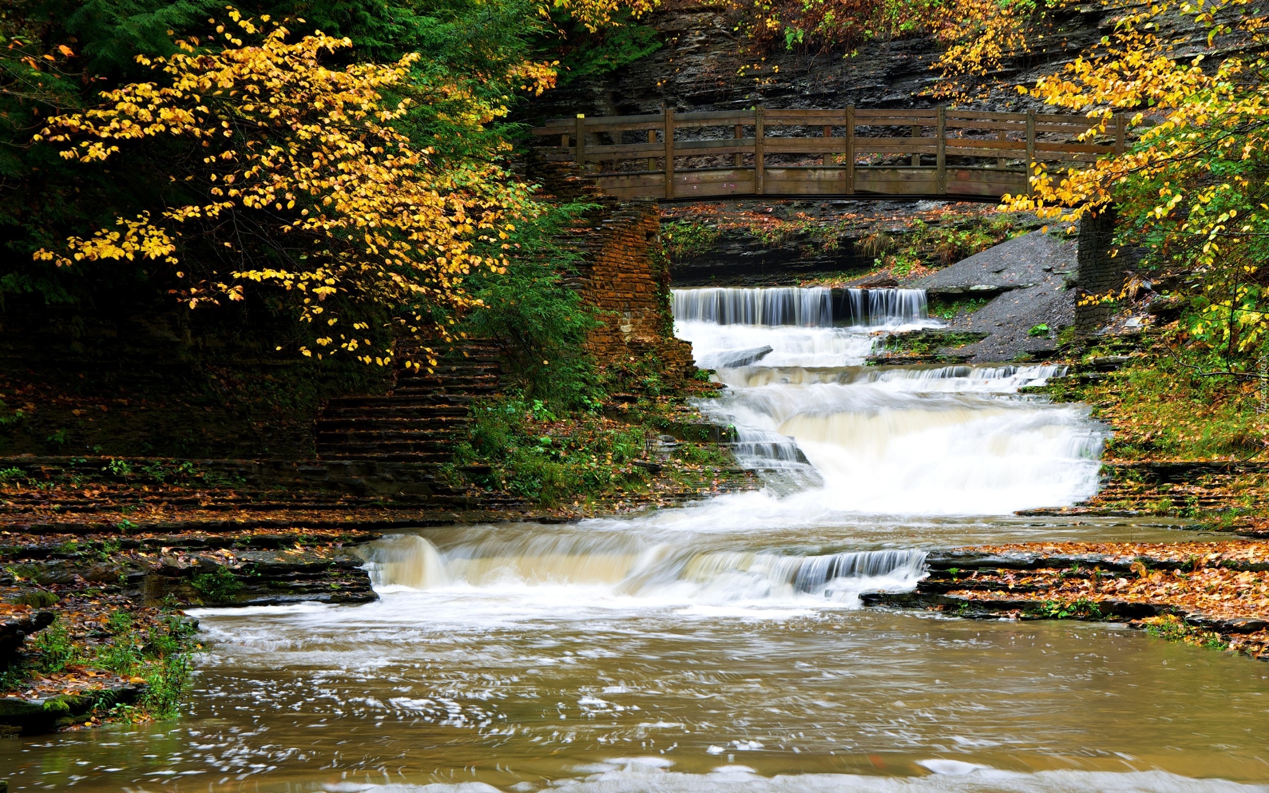 Edytor tapety: Wodospad, Most, Rzeka, Skały, Las, Jesień