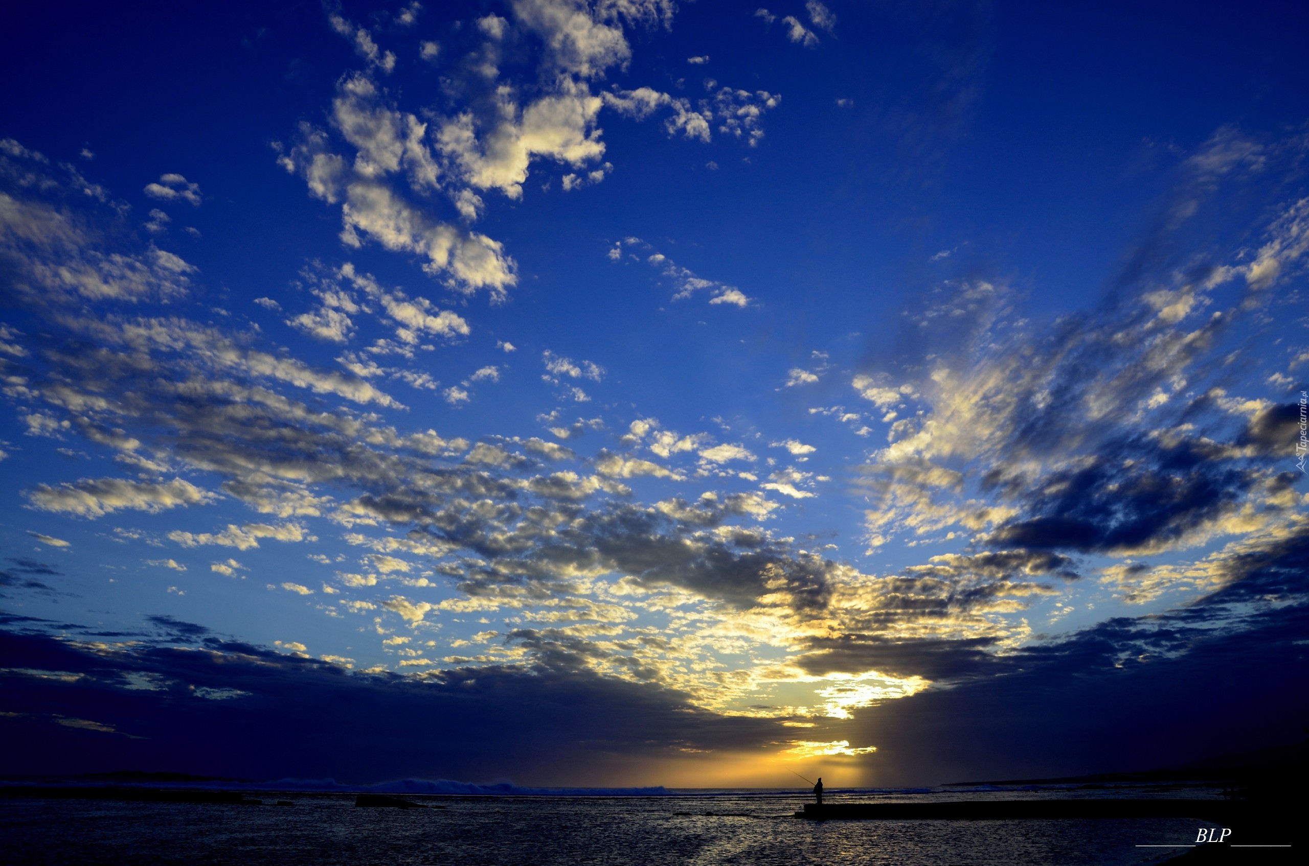 Edytor tapety: Molo, Wędkarz, Morze, Ciemne, Chmury, Przebijające, Światło