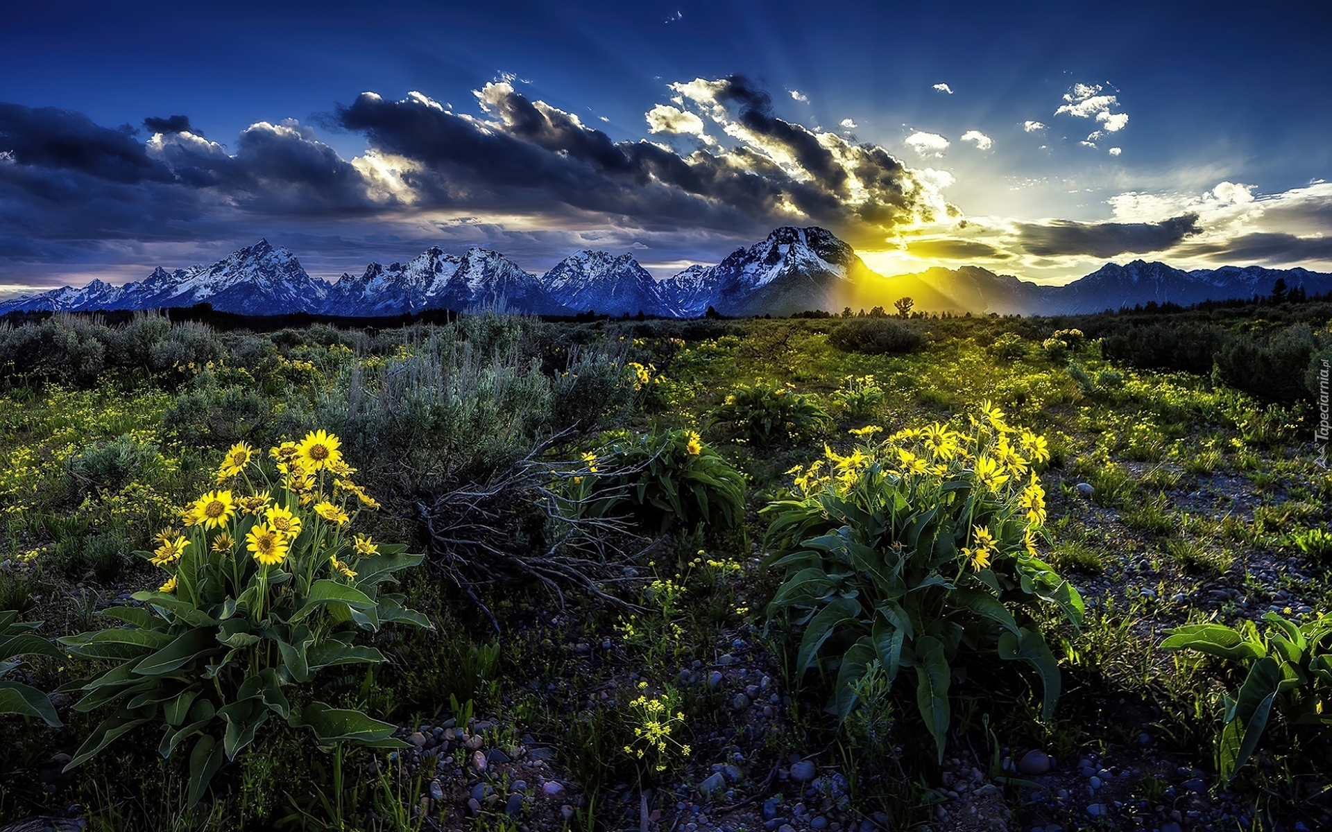 Edytor tapety: Góry, Niebo, Ciemne, Chmury, Promienie, Słońca, Łąka