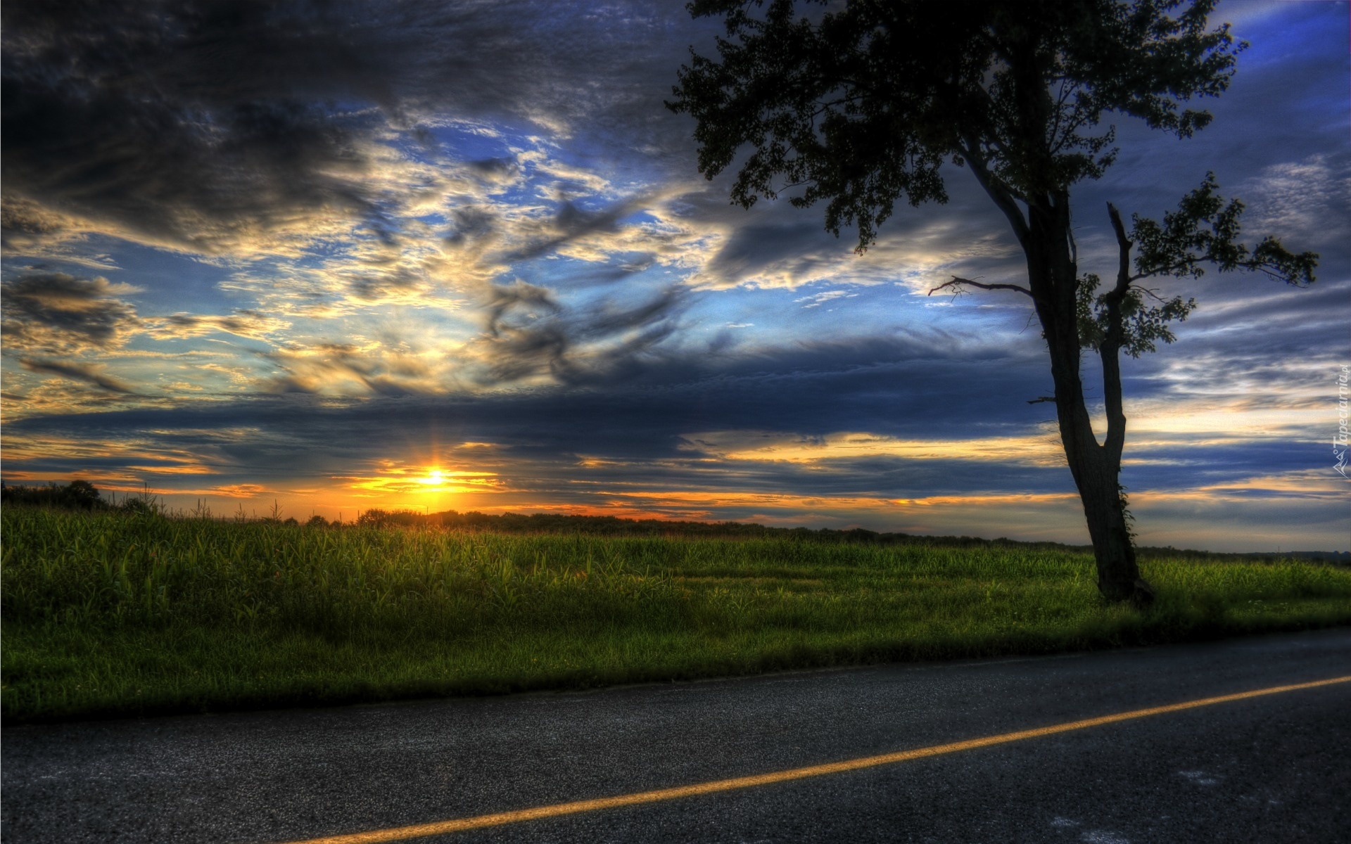 Edytor tapety: Droga, Drzewo, Łąki, Chmury, Zachód, Słońca