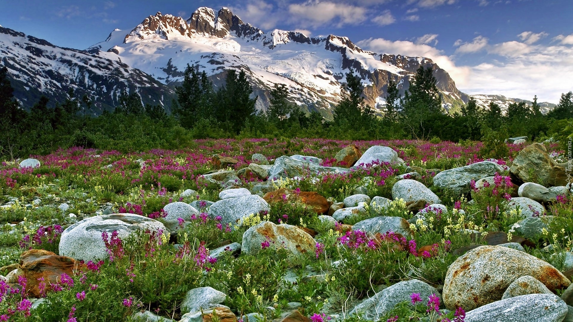 Edytor tapety: Góry, Świerki, Łąka, Kamienie