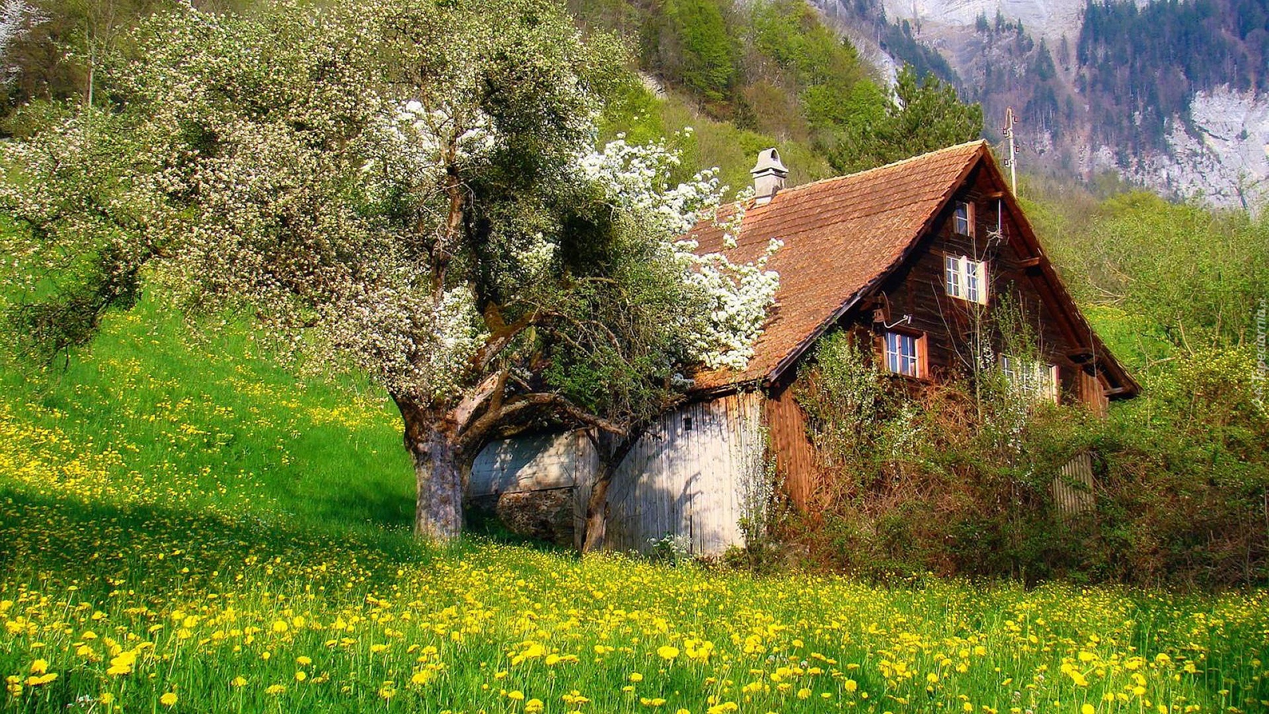 Edytor tapety: Wiosna, Góry, Łąka, Drewniany, Domek, Mniszek, Drzewo