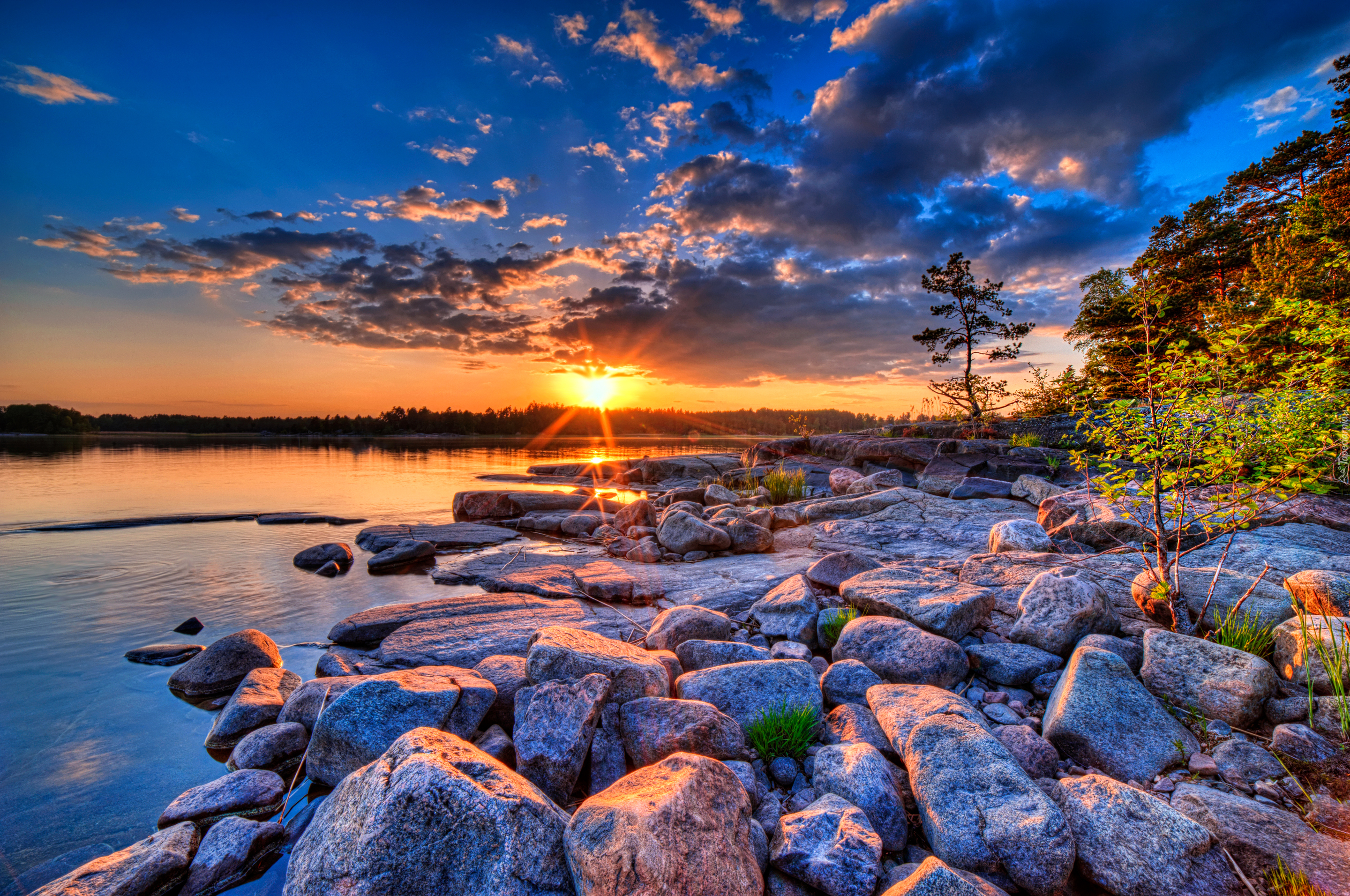 Edytor tapety: Jezioro, Kamienie, Zachód, Słońca