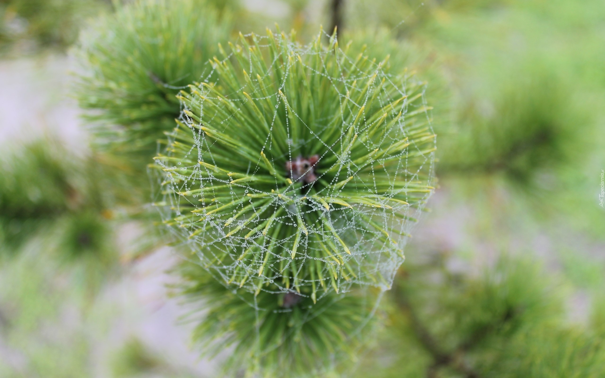 Edytor tapety: Sosna, Pajęczyna, Gałązki, Krople, Wody