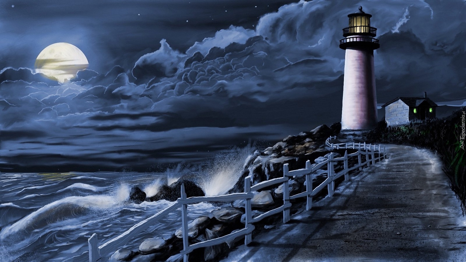 Edytor tapety: Latarnia, Morska, Morze, Skały, Księżyc, Noc, Chmury, Grafika