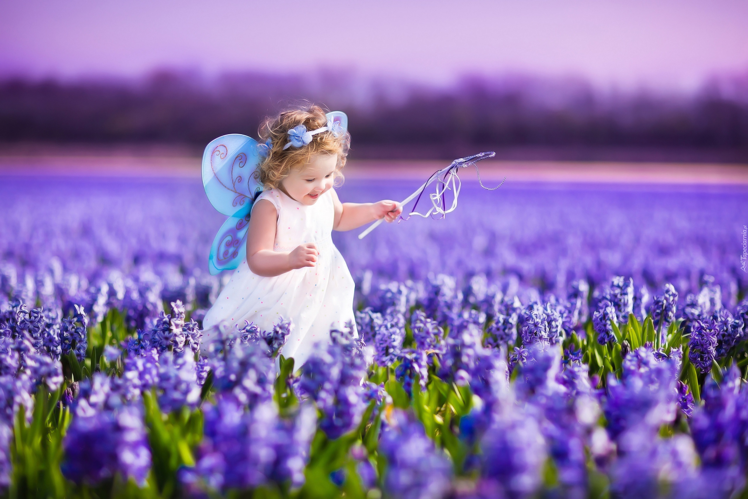 Edytor tapety: Radosna, Dziewczynka, Skrzydła, Motyla, Niebieskie, Kwiaty