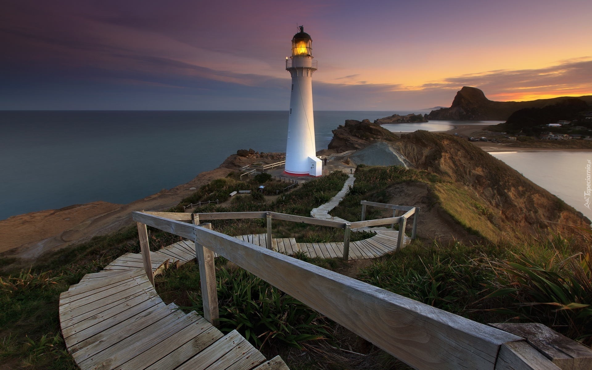 Edytor tapety: Latarnia, Morska, Skały, Schody, Morze, Zachód, Słońca