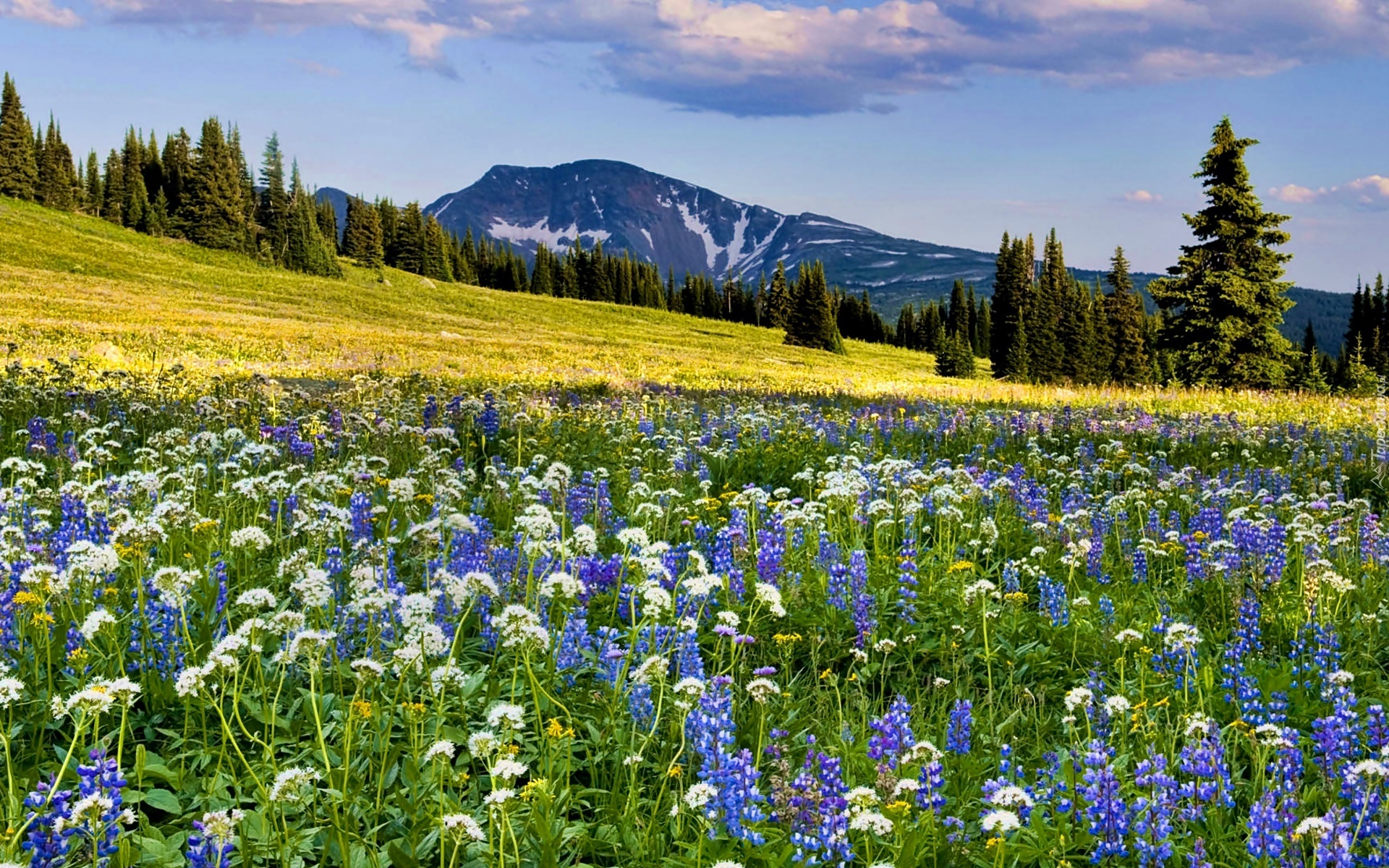 Edytor tapety: Góry, Świerki, Łąka, Łubin