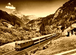 Edytor tapety: Alpy, Lasy, Dolina, Wioska, Pociąg