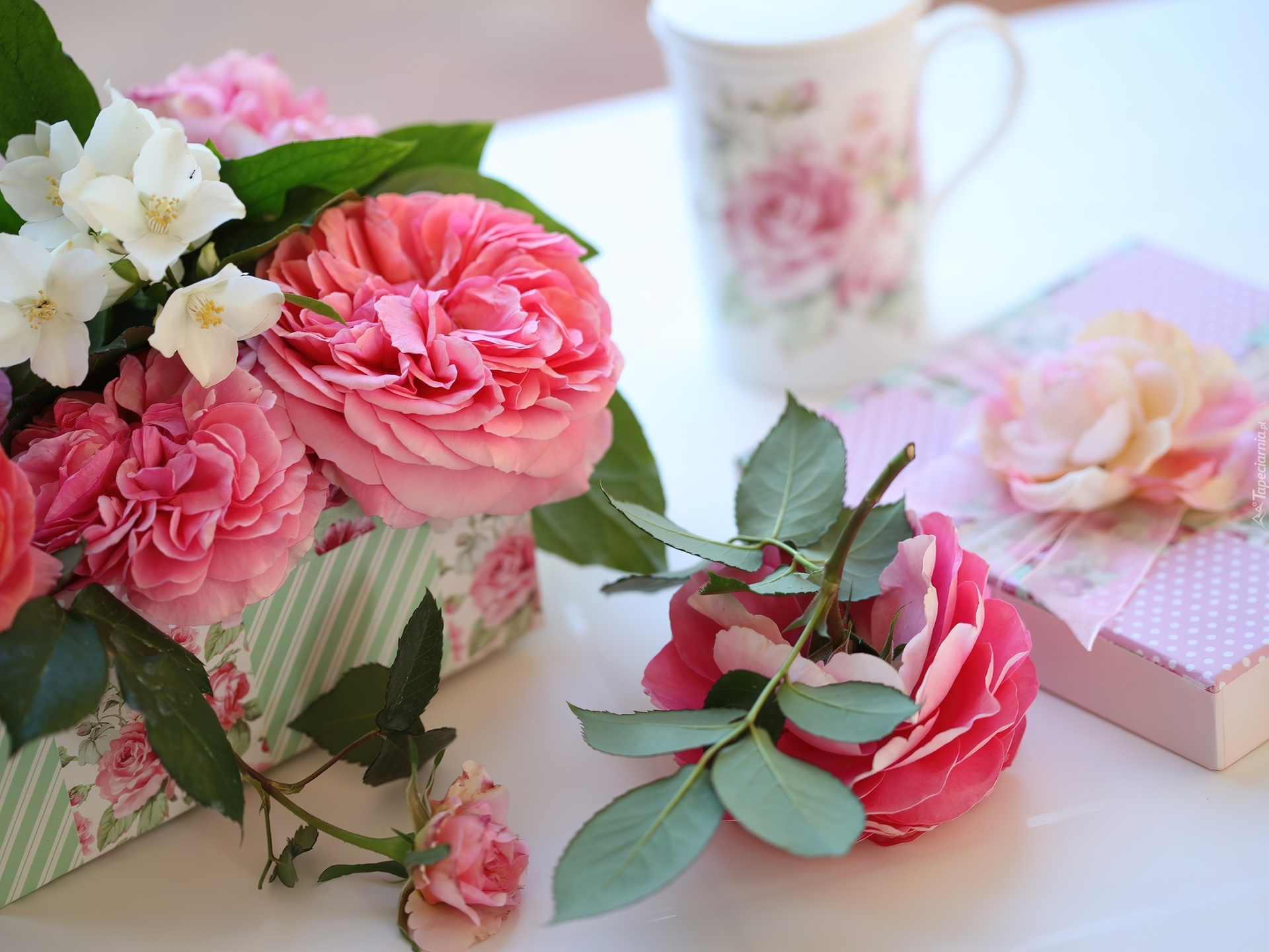 Edytor tapety: Róże, Filiżanka, Prezenty