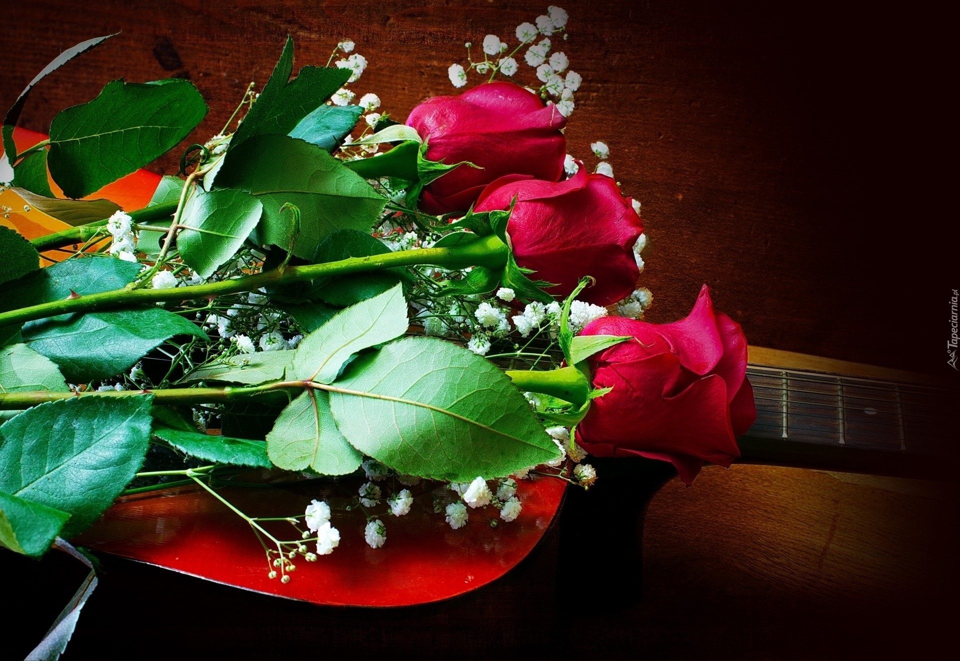 Edytor tapety: Czerwone, Róże, Gitara, Kompozycja