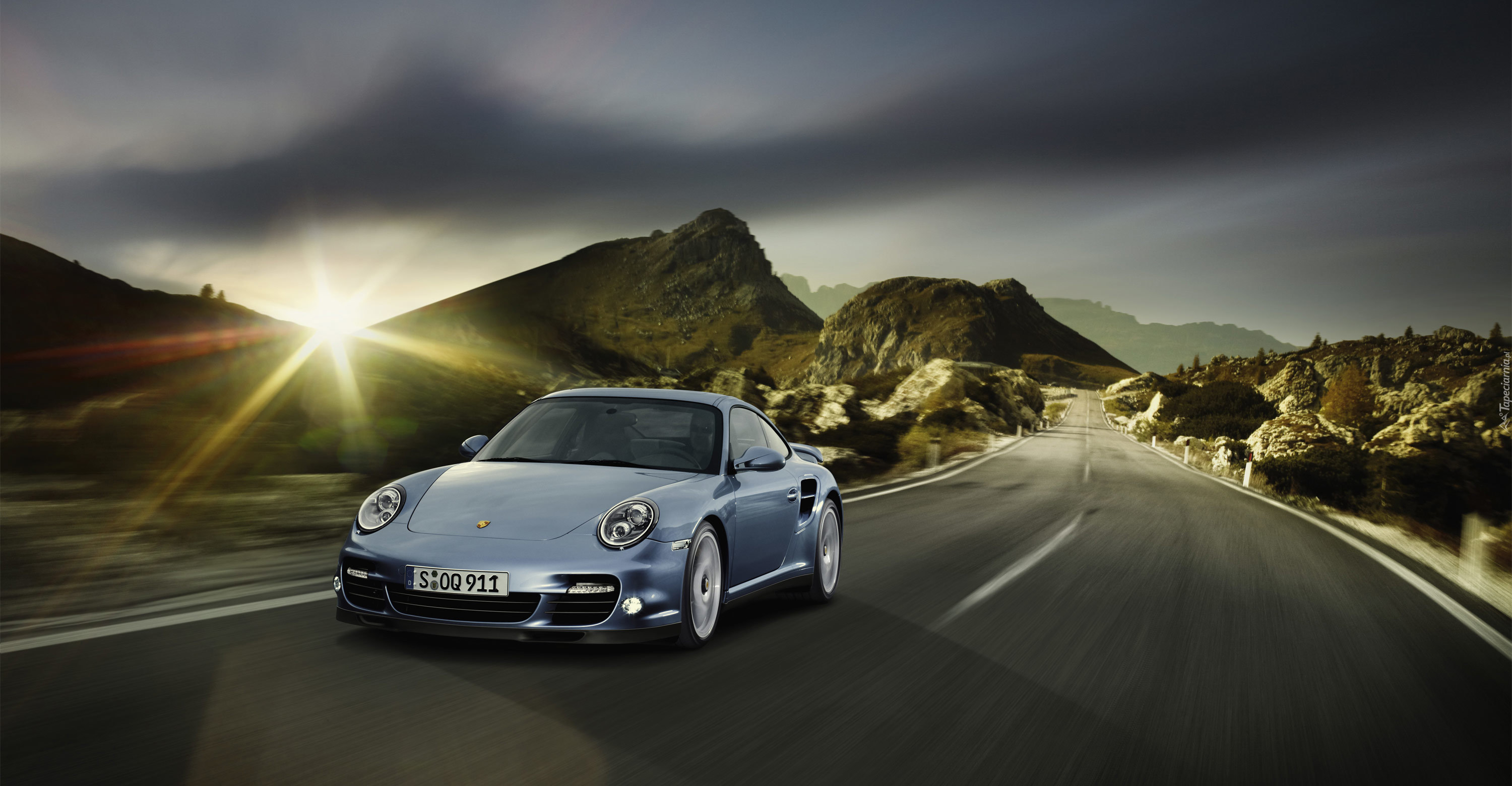Edytor tapety: Samochód, Porsche, 911, Turbo, Droga, Góry, Promienie, Słońca
