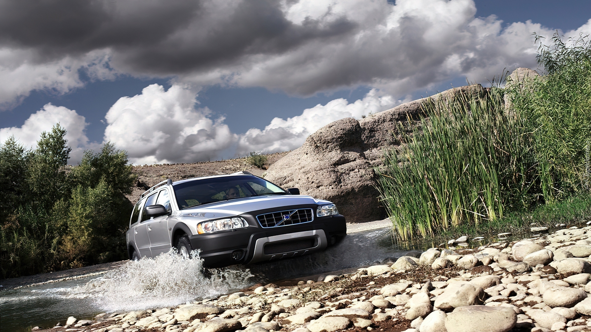 Edytor tapety: Samochód, Volvo, XC70, Skały, Kamienie, Rzeka, Trzciny, Chmury