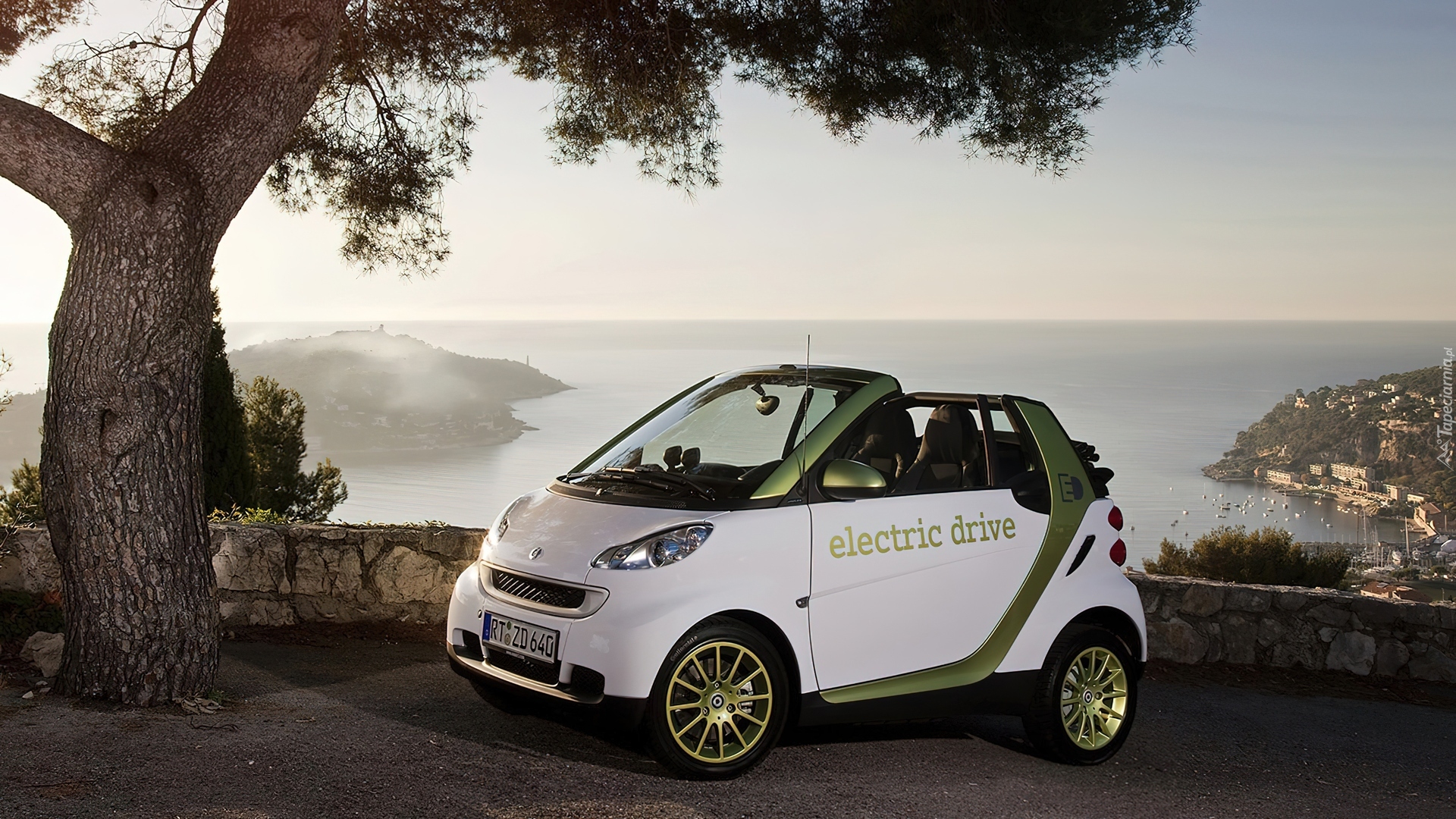 Edytor tapety: Samochód, Smart, Fortwo, Drzewo, Morze, Skały