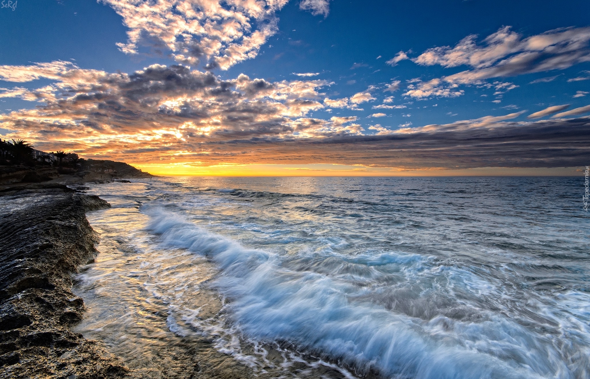 Edytor tapety: Morze, Fale, Wybrzeże, Chmury, Wschód, Słońca
