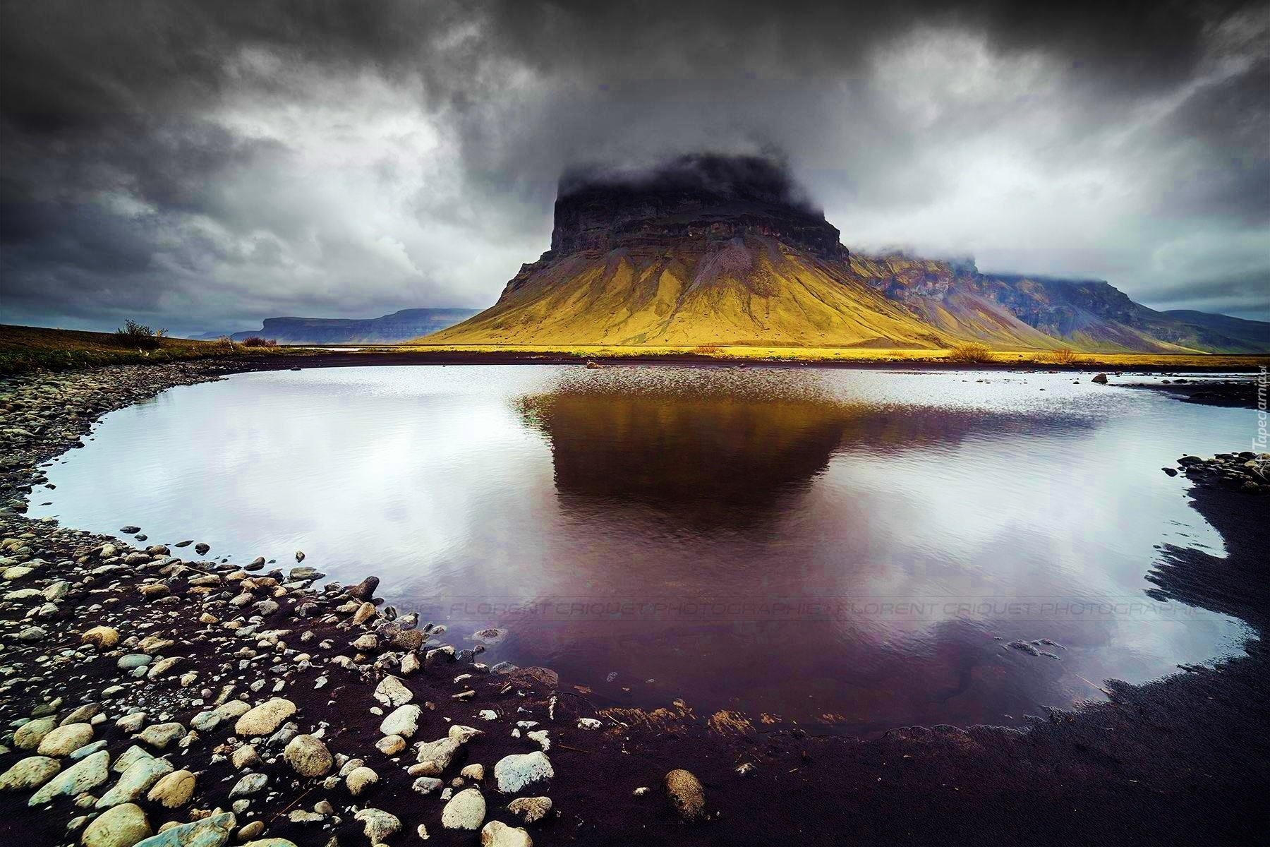 Edytor tapety: Góra, Chmury, Jeziorko, Kamienie