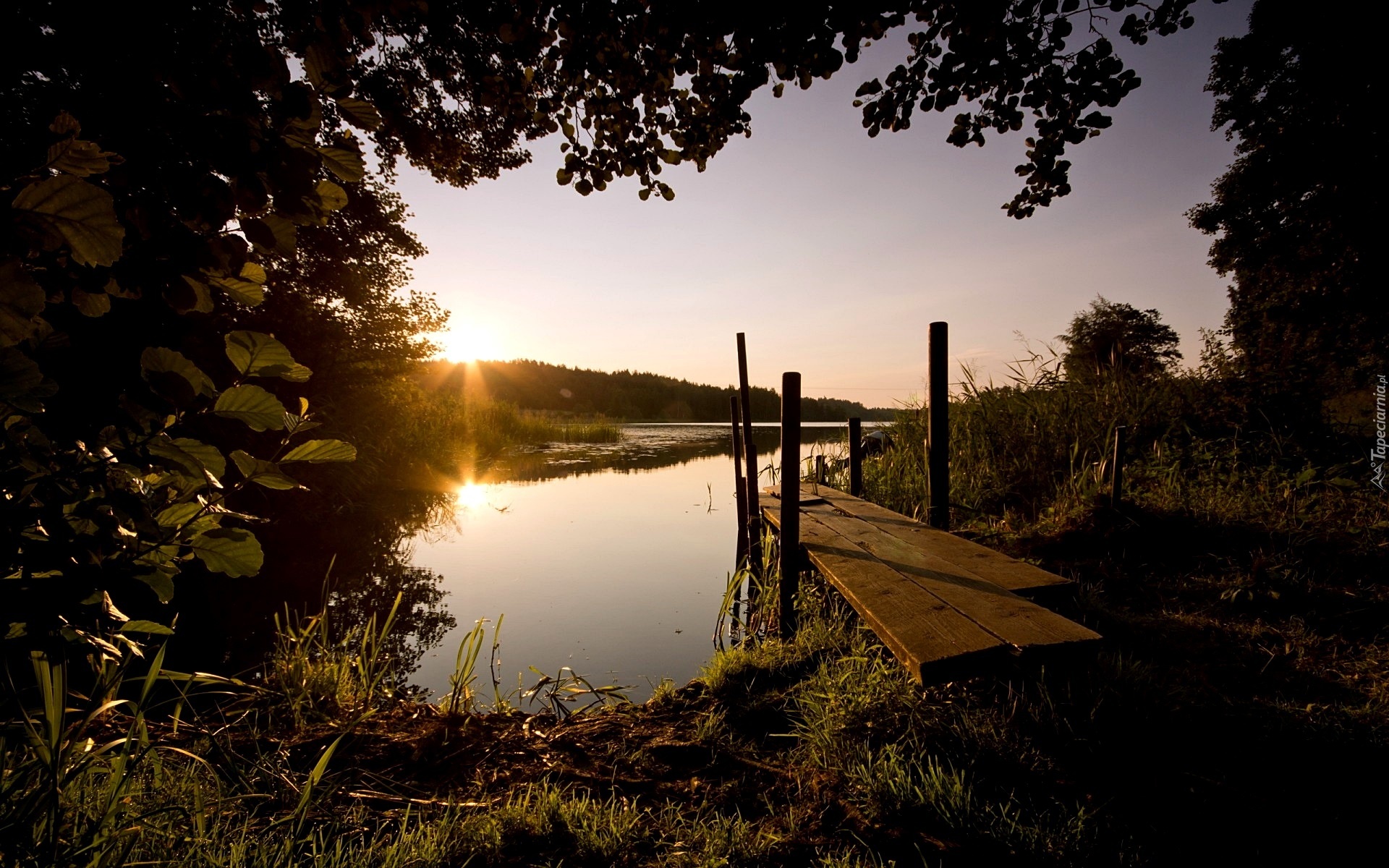 Edytor tapety: Jezioro, Pomost, Drzewa, Wschód Słońca