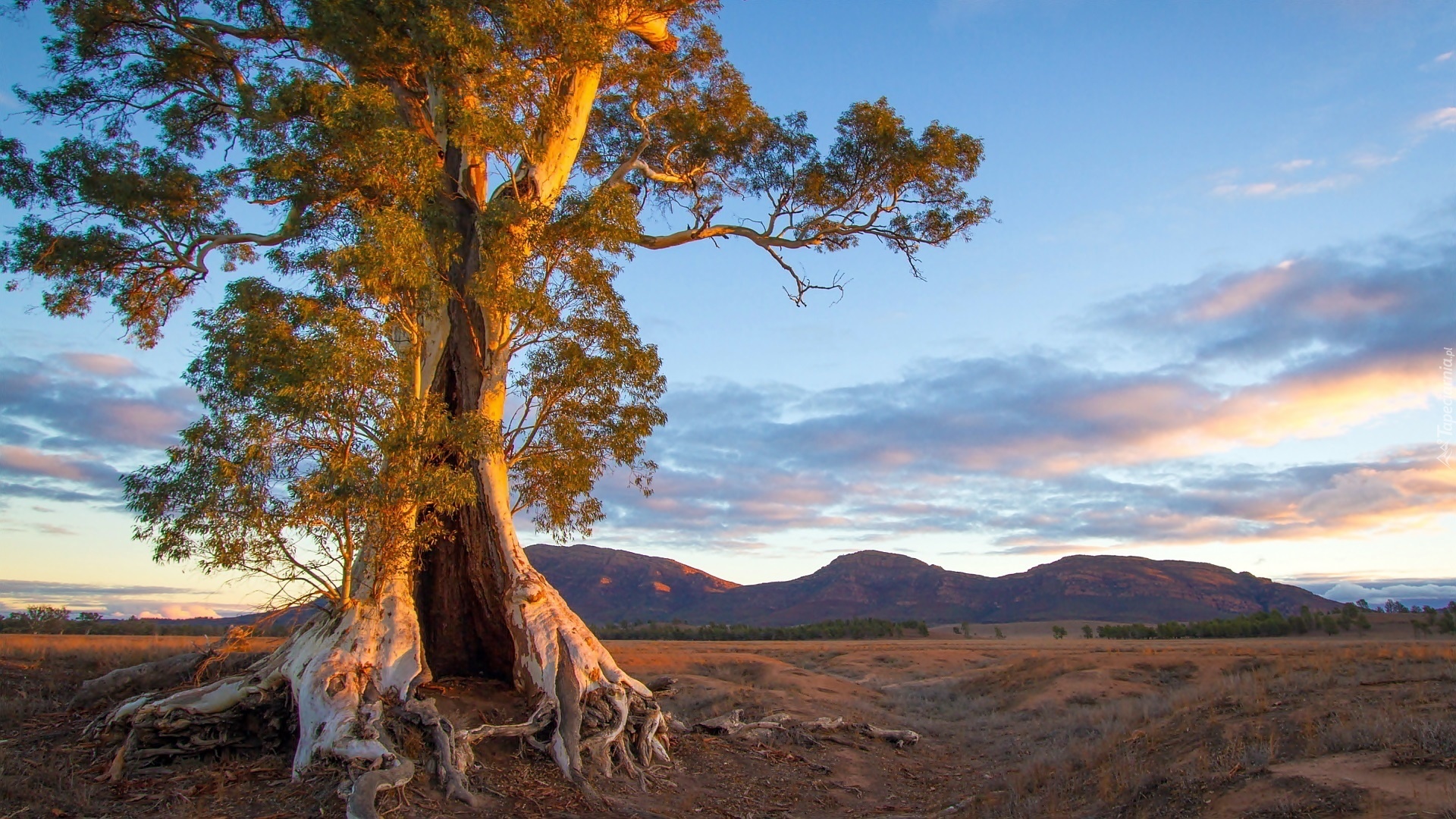 Edytor tapety: Wzgórza, Łąka, Samotne, Drzewo, Świt