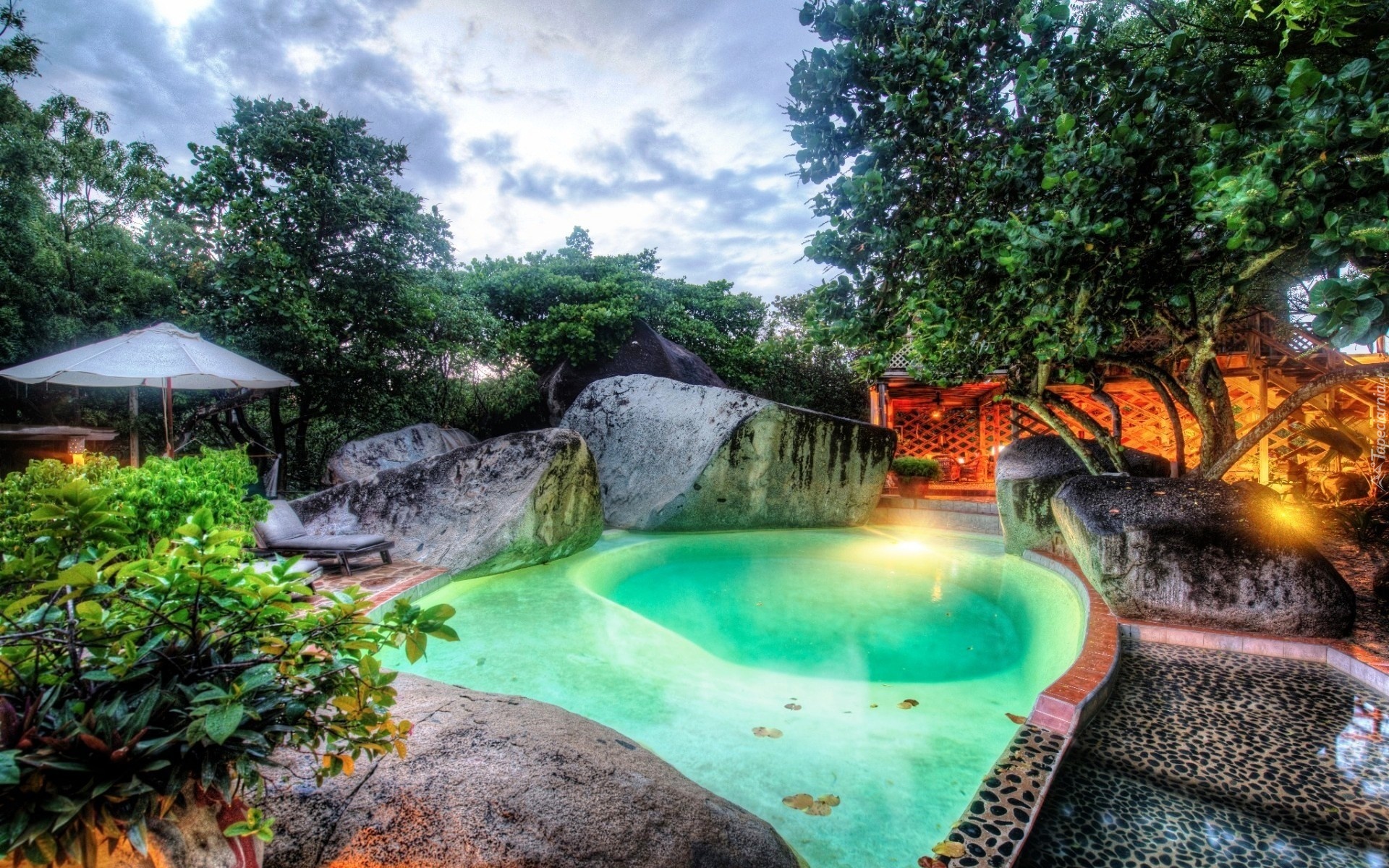 Edytor tapety: Basen, Skały, Drzewa