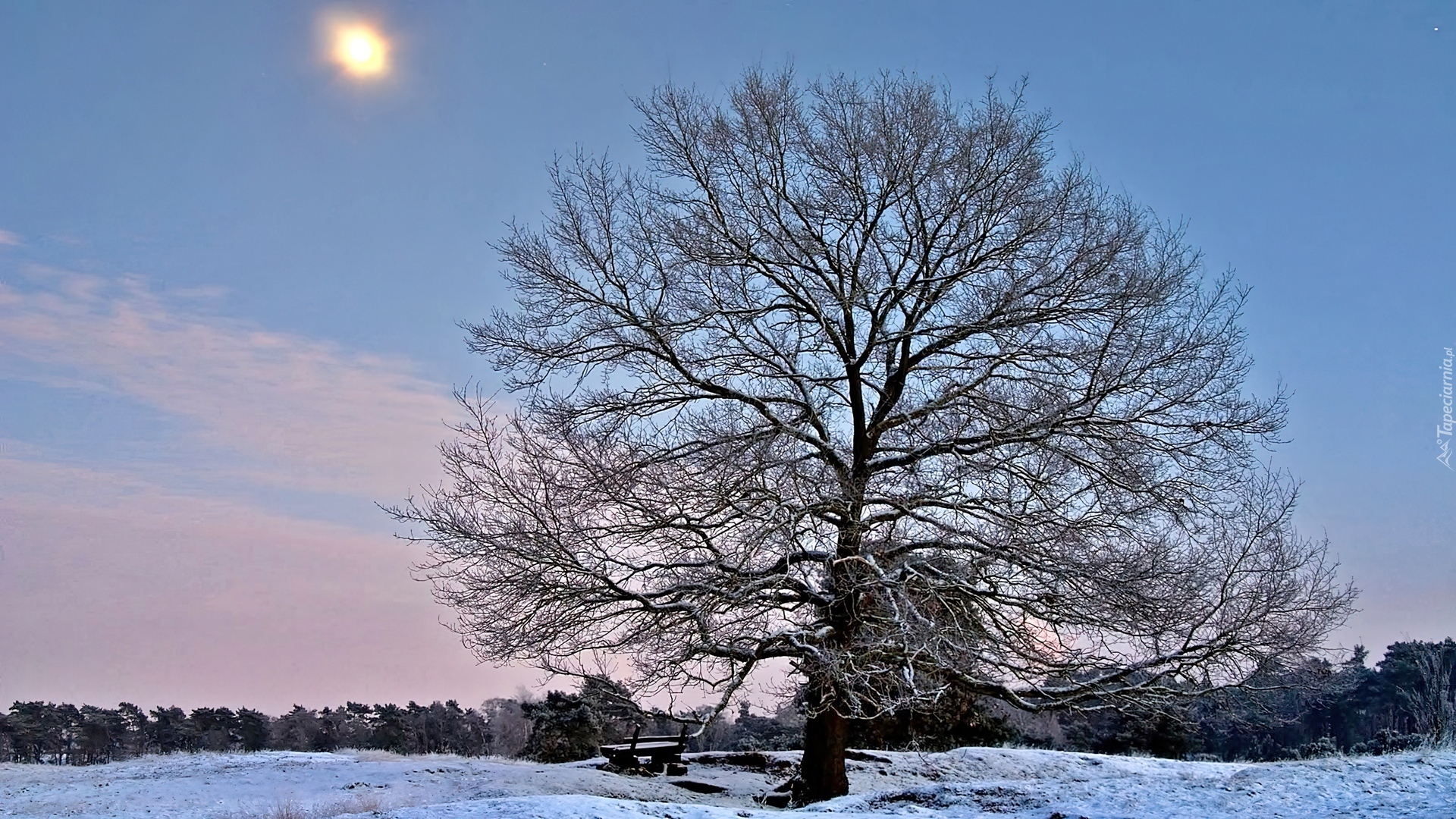 Edytor tapety: Ośnieżone, Pole, Samotne, Drzewo, Świt