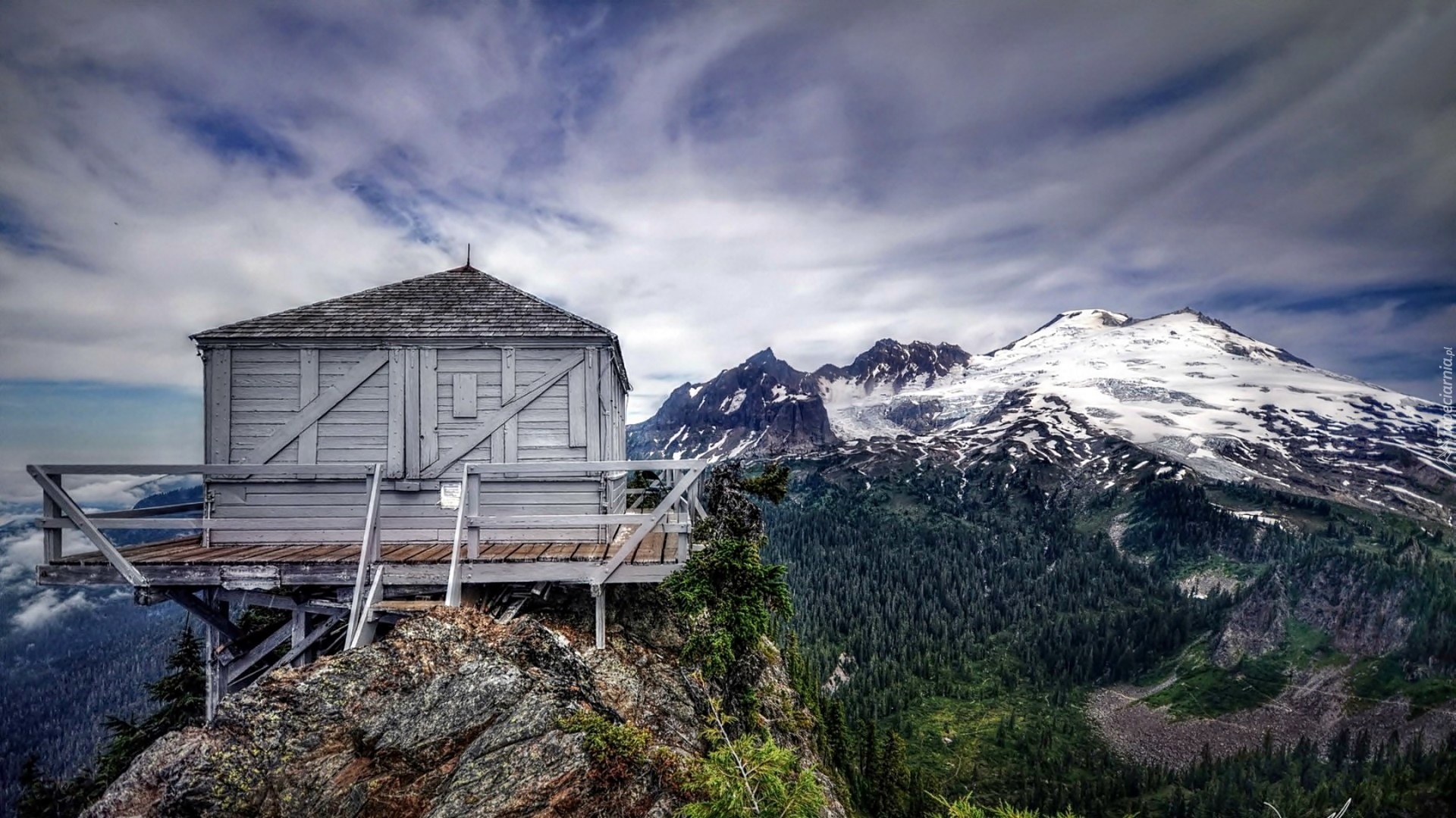 Edytor tapety: Góry, Lasy, Drewniany, Domek, Na Platformie