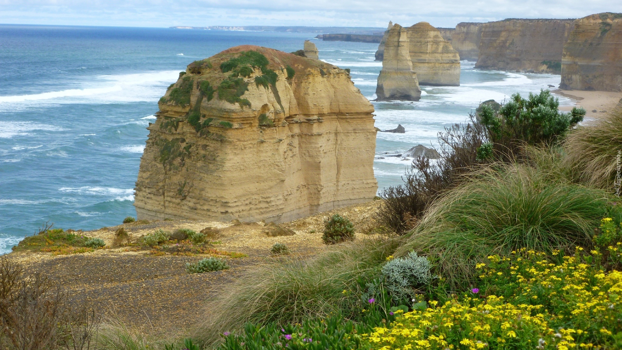 Edytor tapety: Morze, Skały, Kwiaty, Trawa