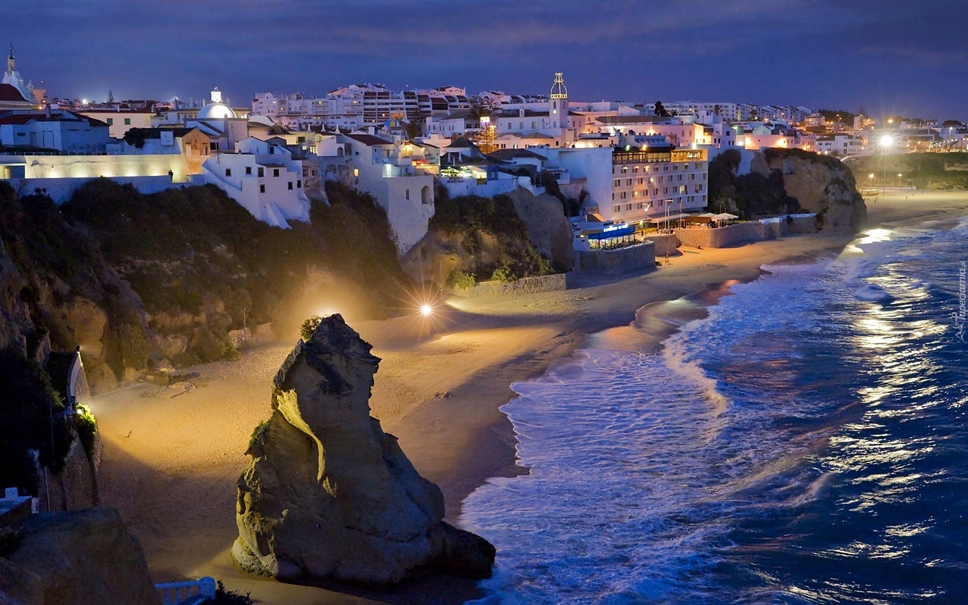 Edytor tapety: Albufeira, Panorama, Miasta, Morze, Wybrzeże, Skały, Noc