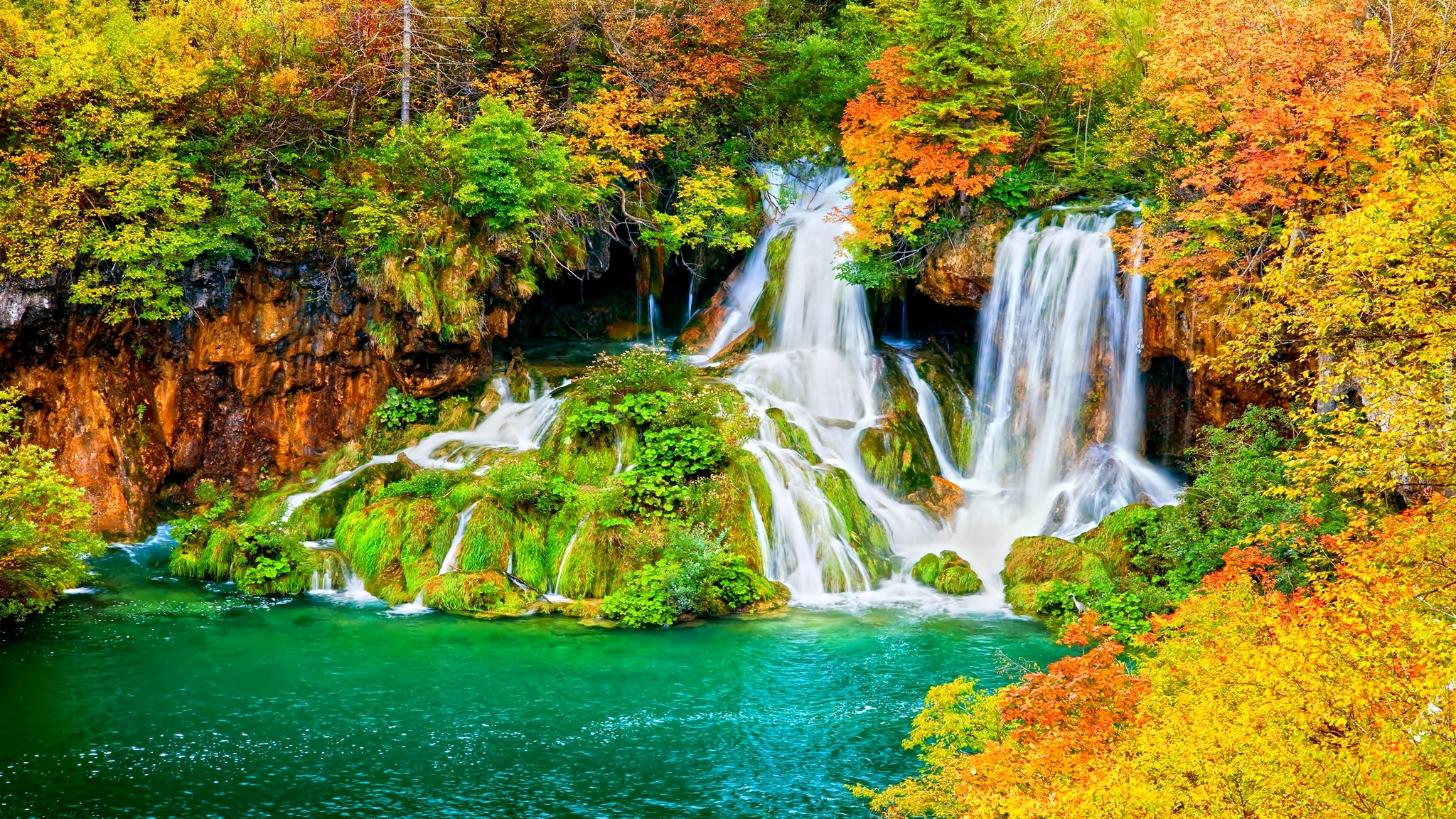 Edytor tapety: Jesień, Las, Skały, Wodospad, Jezioro