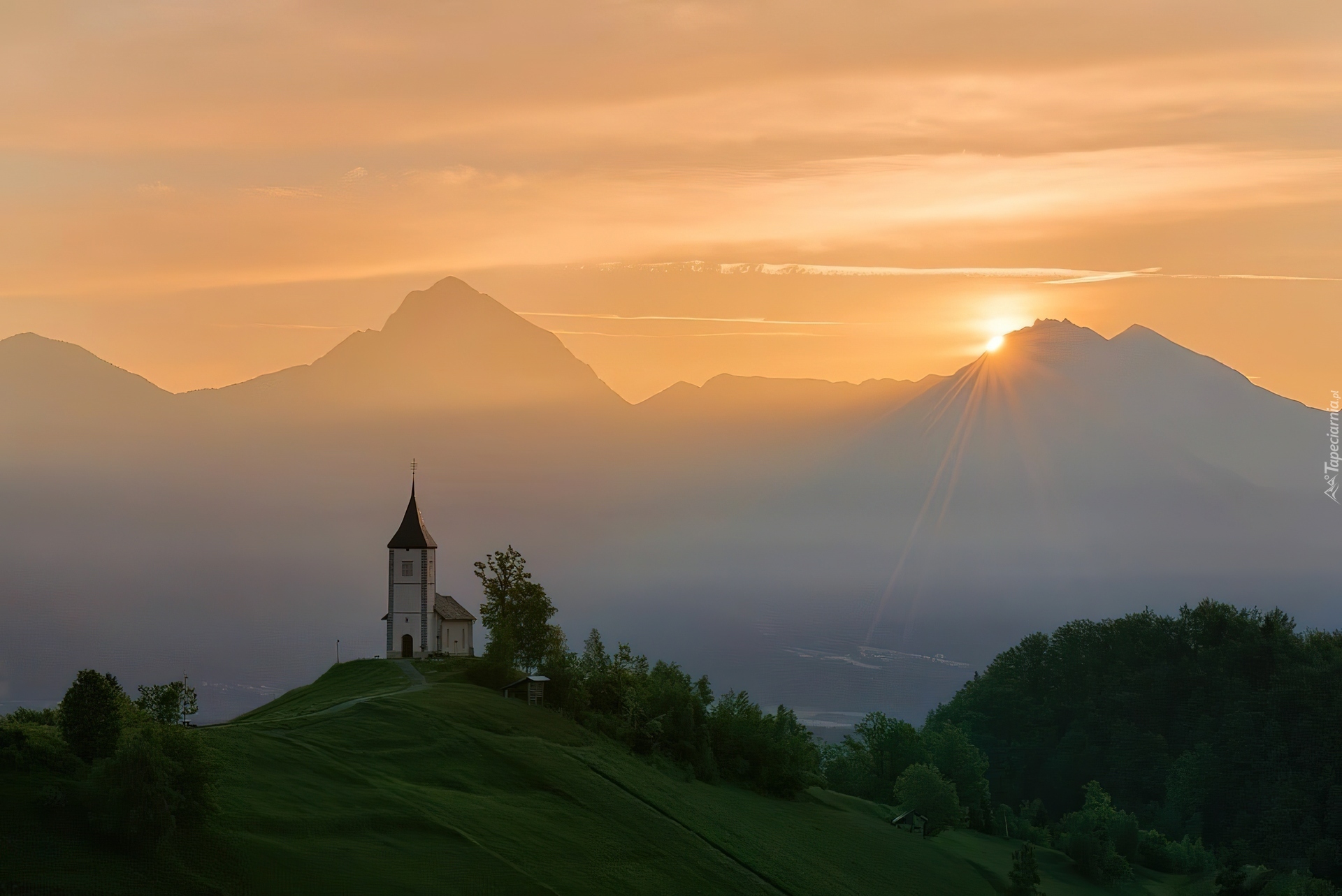 Edytor tapety: Kościółek, Góry, Zachód, Słońca