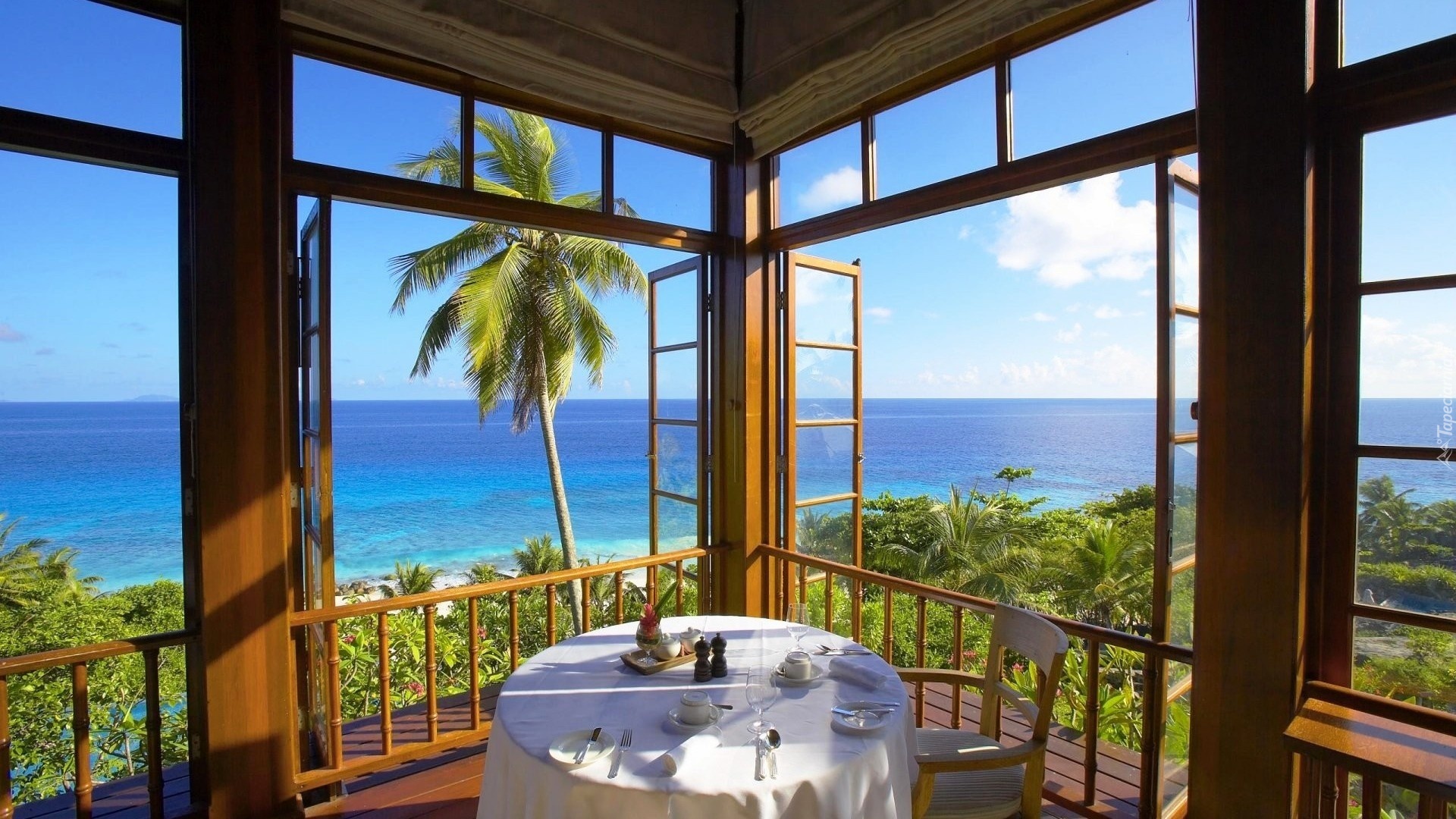Edytor tapety: Dom, Taras, Morze, Palmy